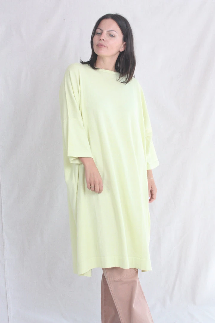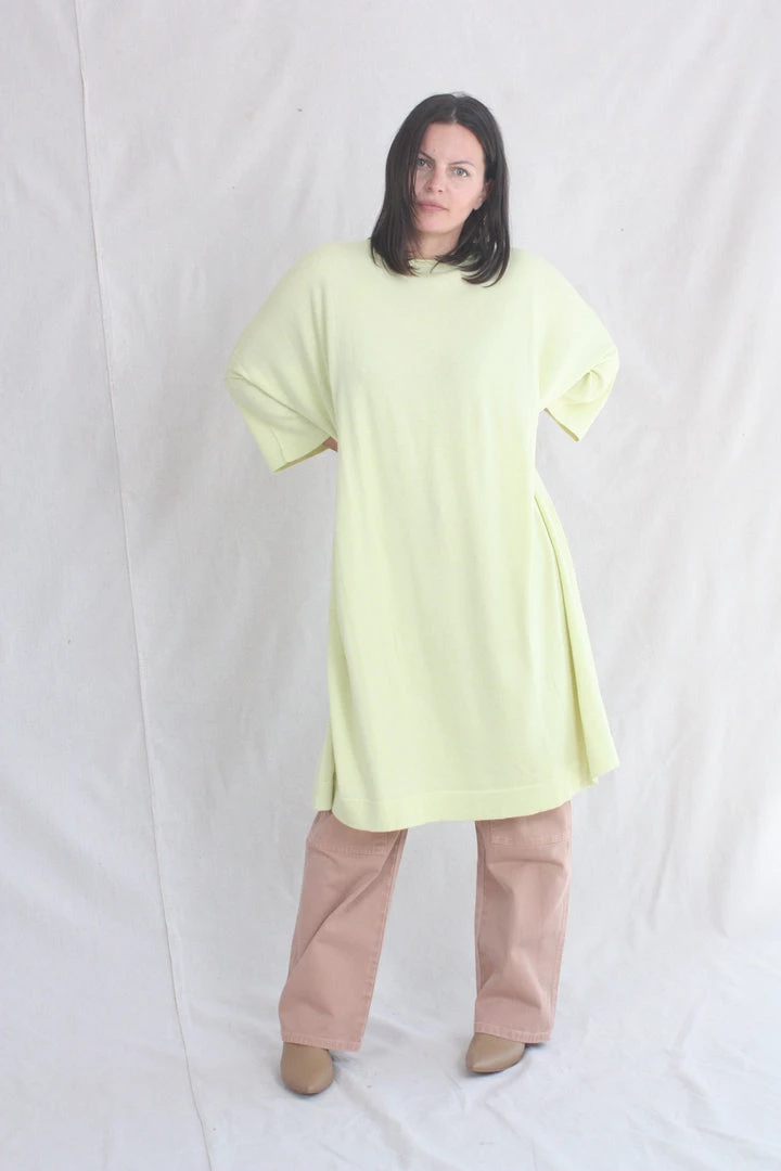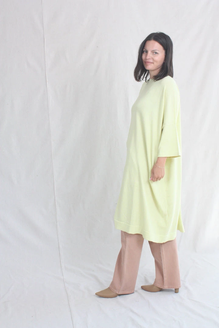 Oversized dress with dropped shoulders and wide sleeves in a fine gauge knit. Side seam pockets. Hits mid calf.