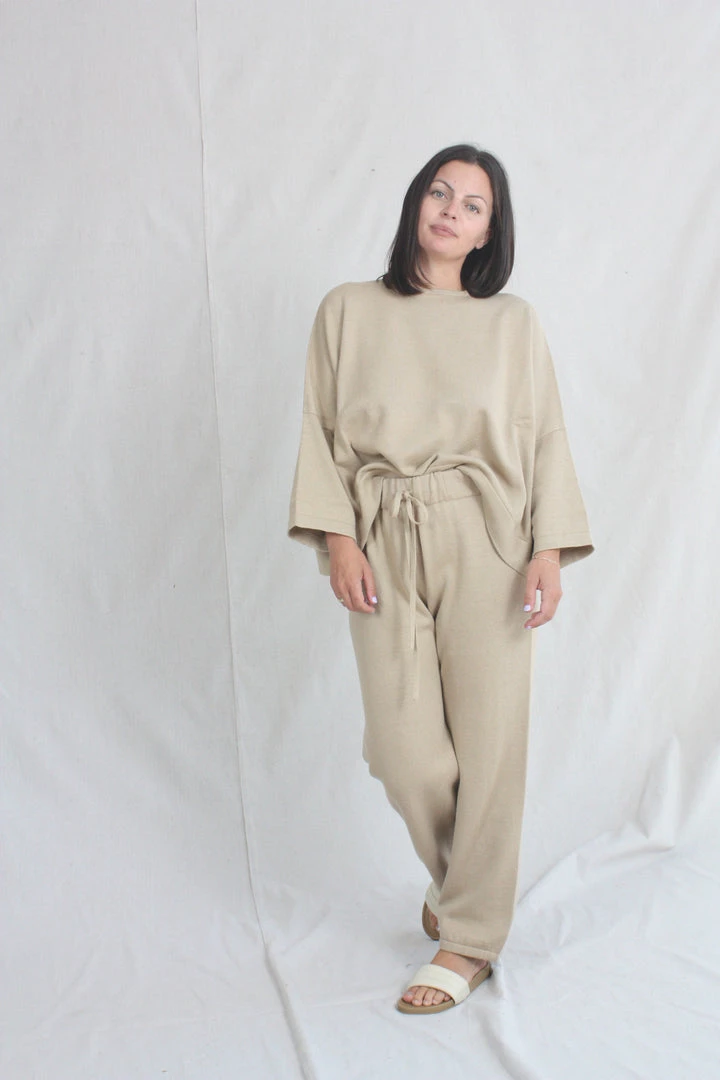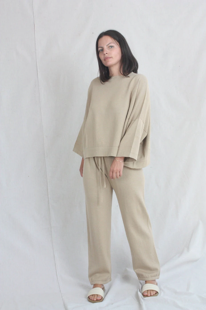 Relaxed pant in a mid gauge knit. Elastic waist with drawstring and elastic button cuff.