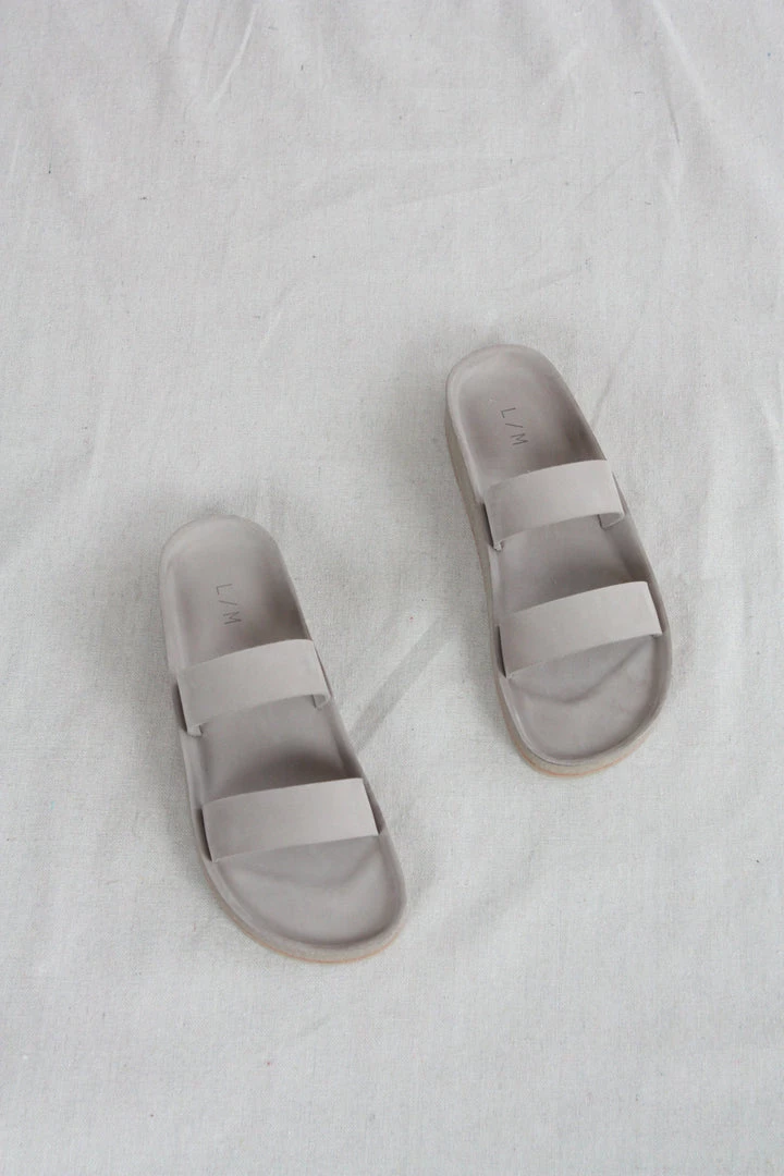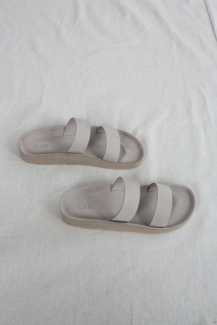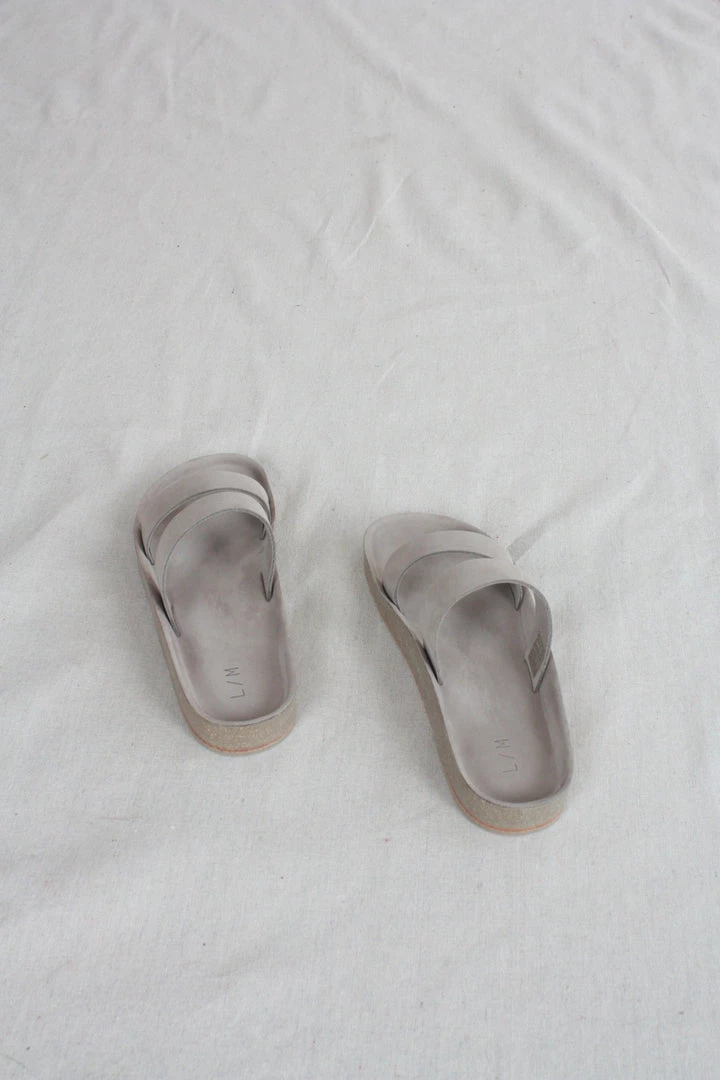 Double band raw vegetable tanned leather upper. Hand skived. Exposed natural cork footbed. Natural leather sole.