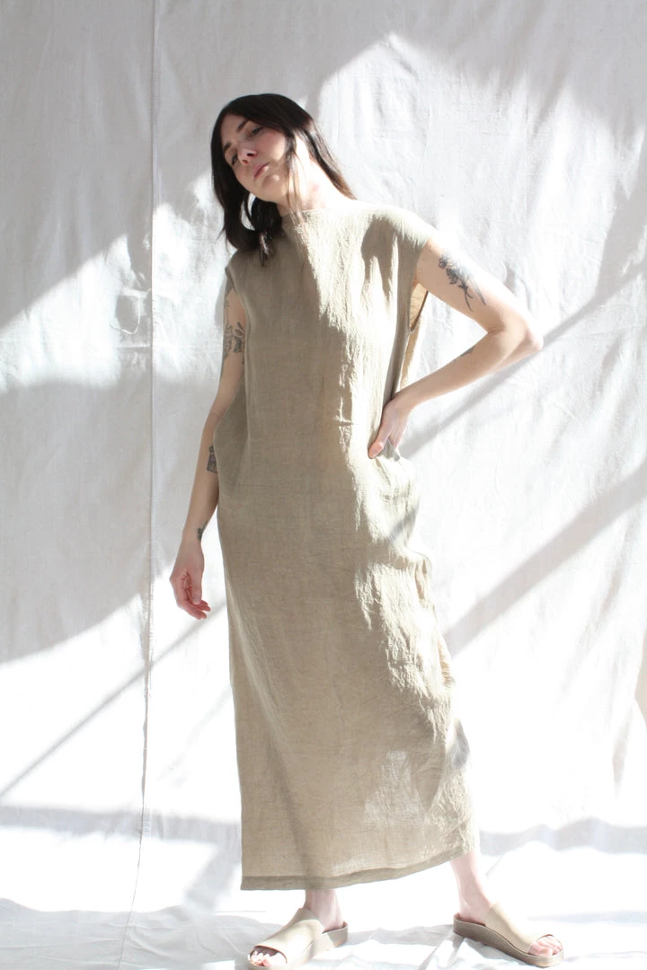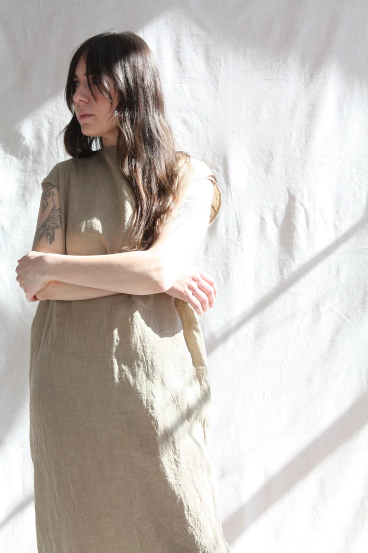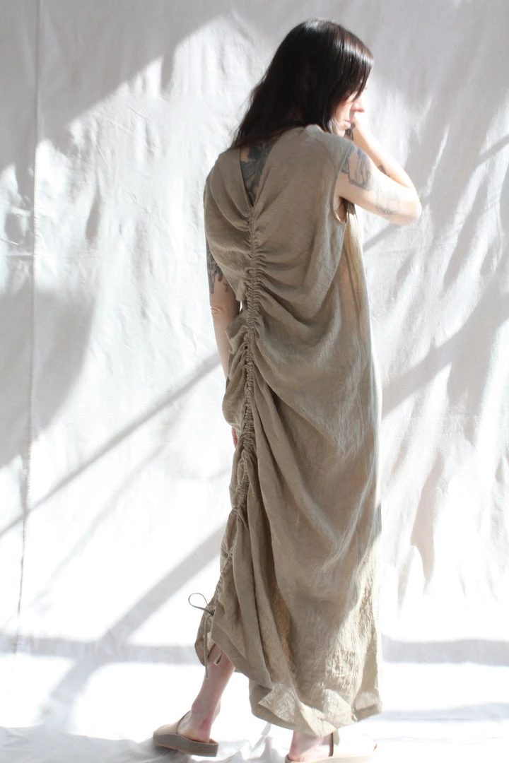 Lightweight linen ruched dress with subtle irregular dye effect. Adjustable ruching, for a customizable fit. Reversible.