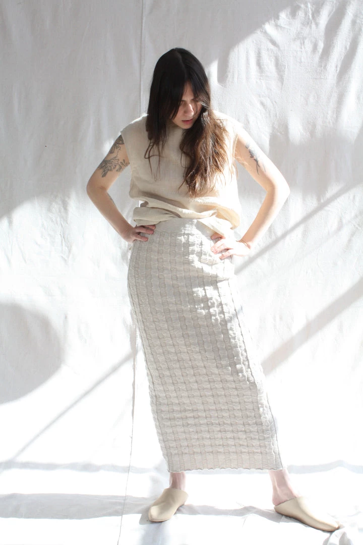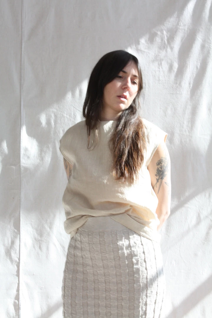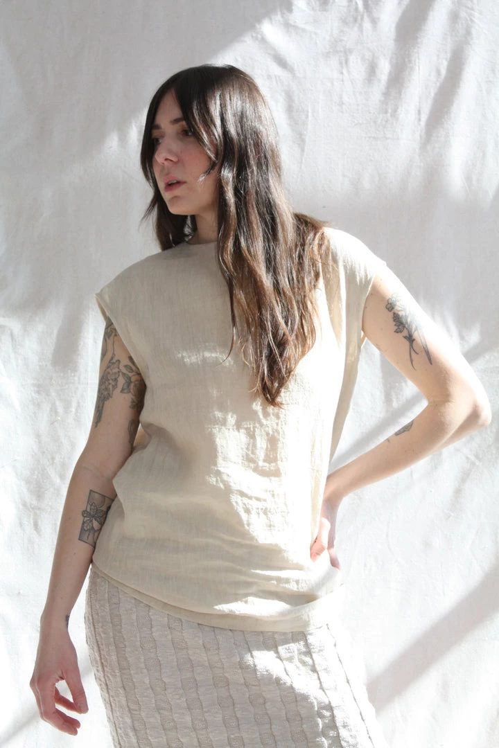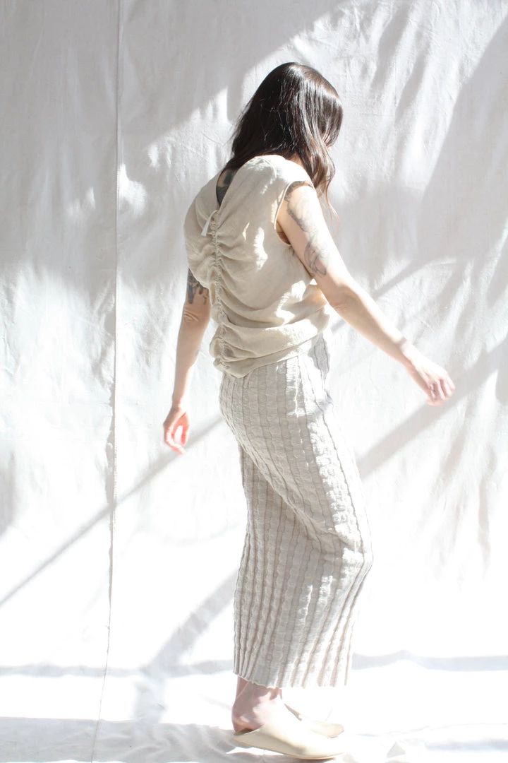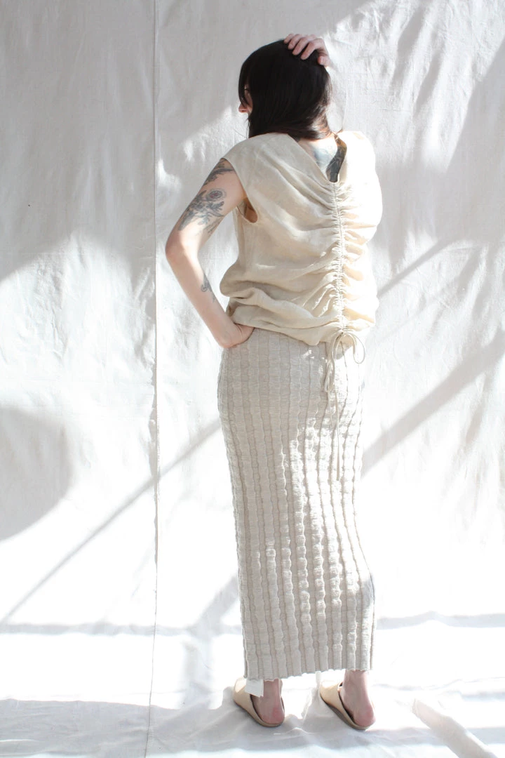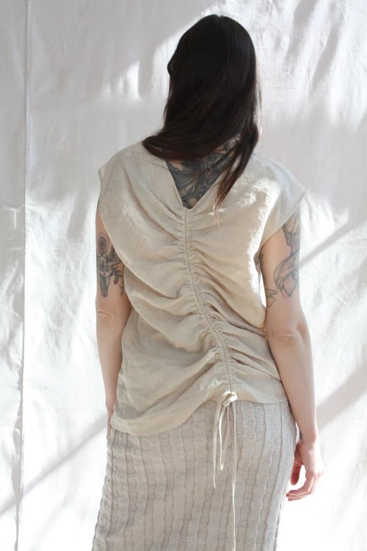 Lightweight linen shell with subtle irregular dye effect. Can be worn both ways with ruche in front or back. Adjustable drawstring for customizable fit.