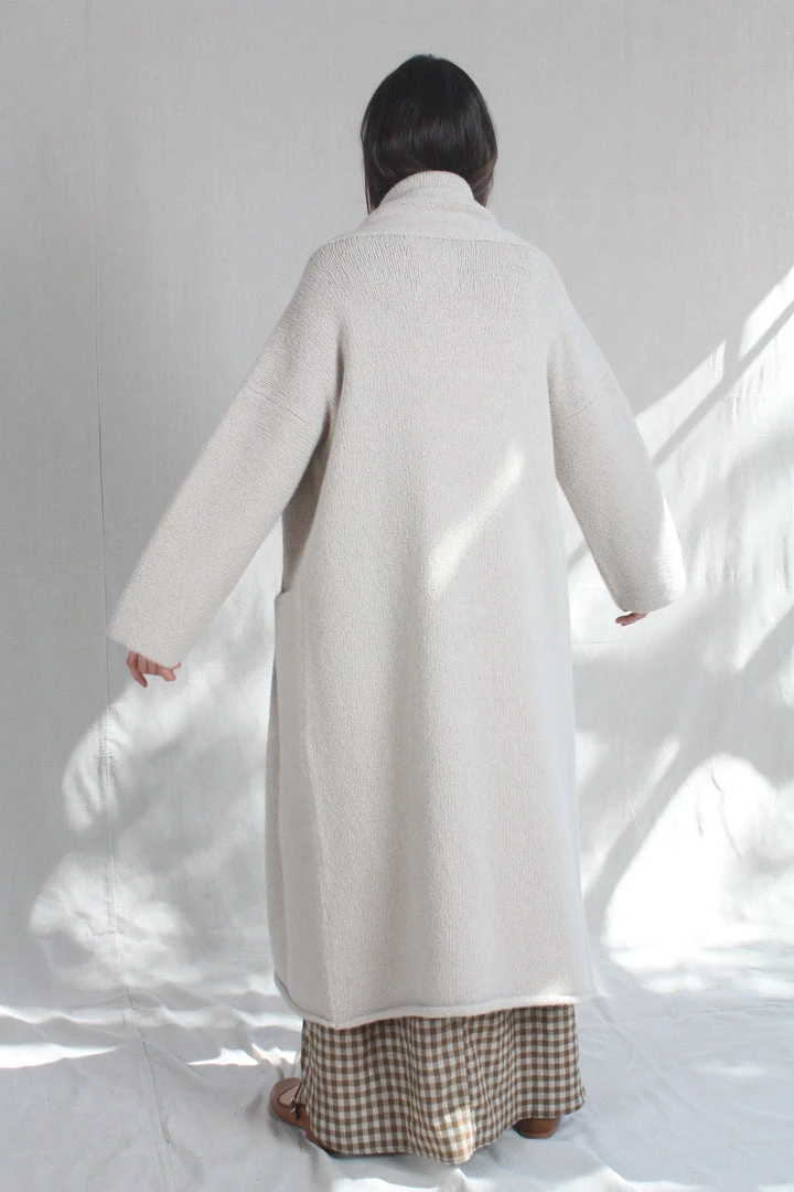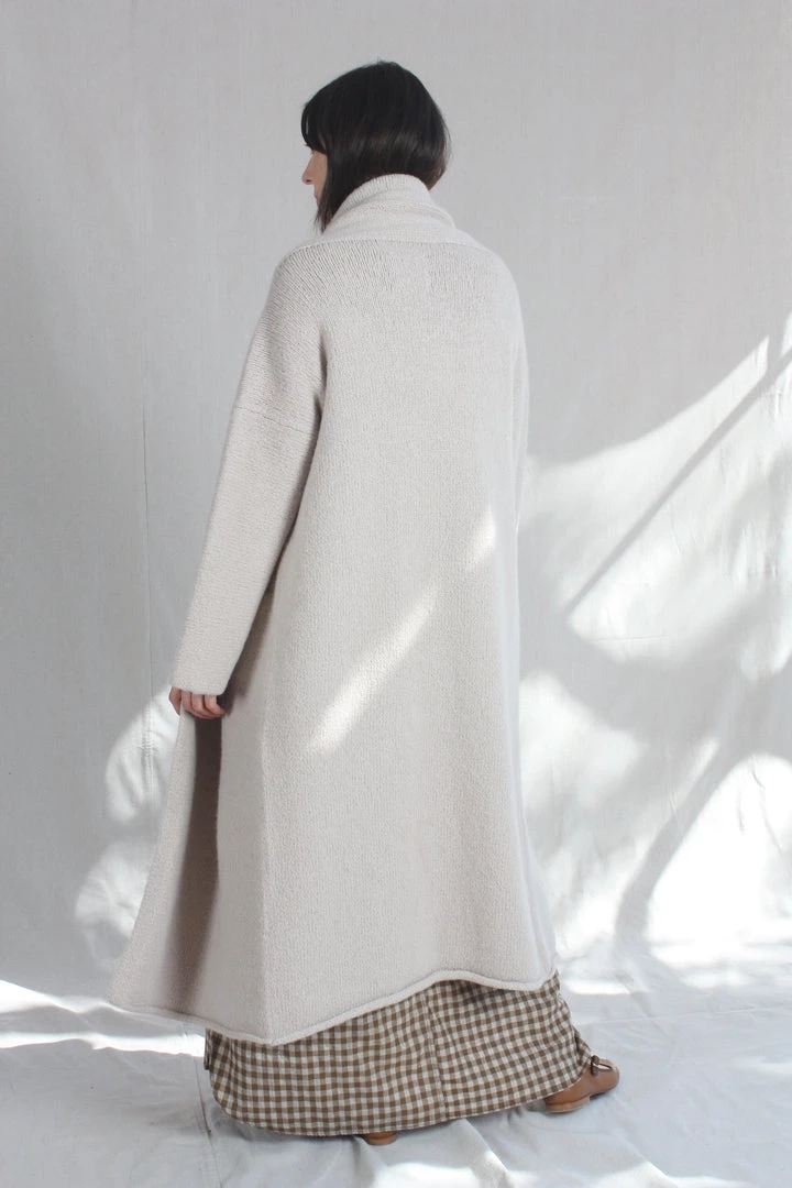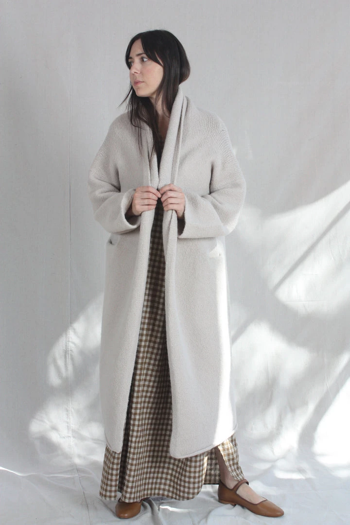 Long cardigan with shawl collar in a soft felted alpaca. LM signature integral pockets.