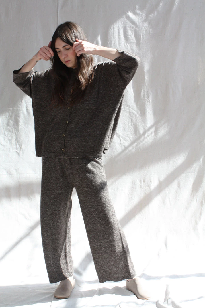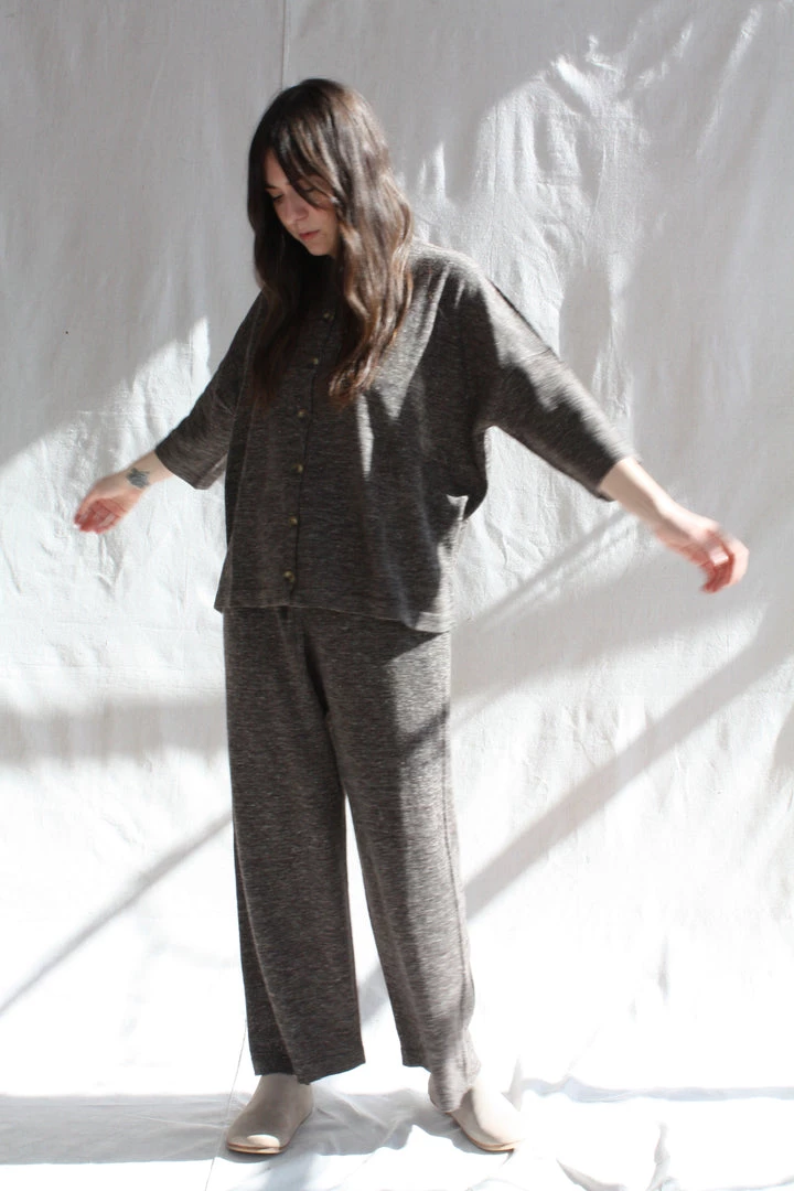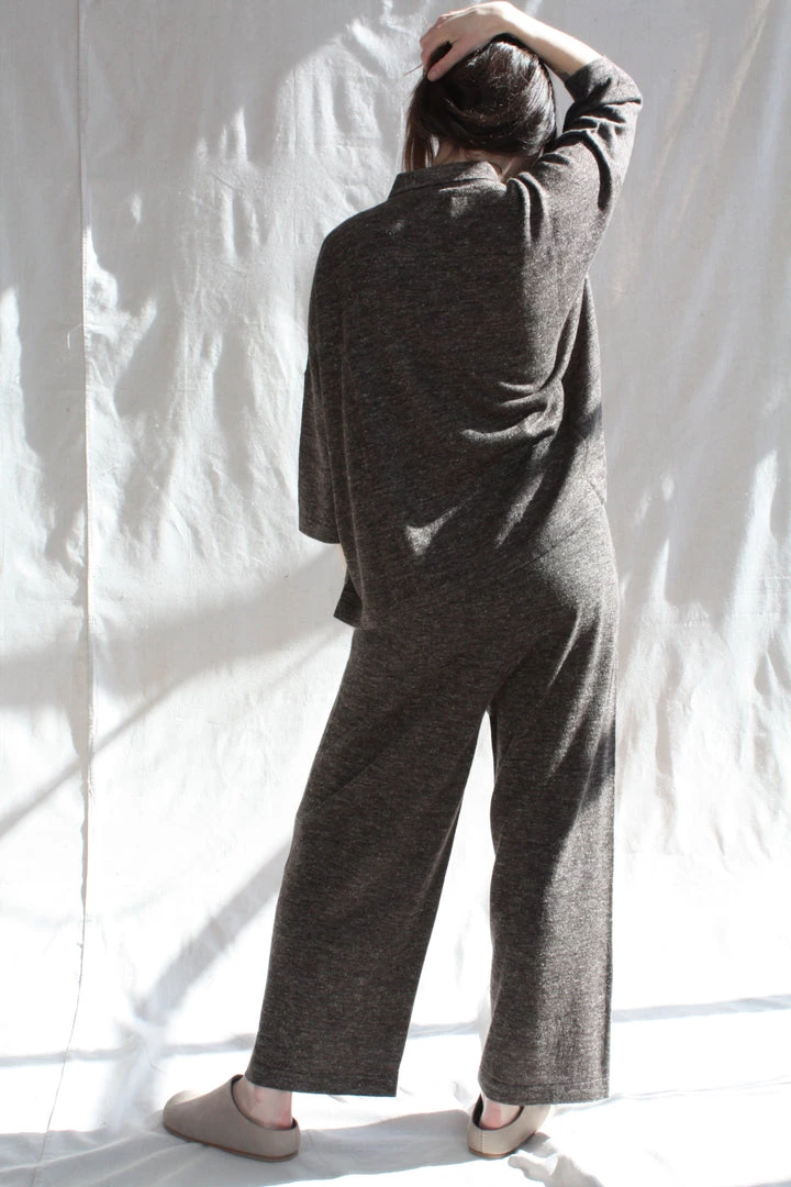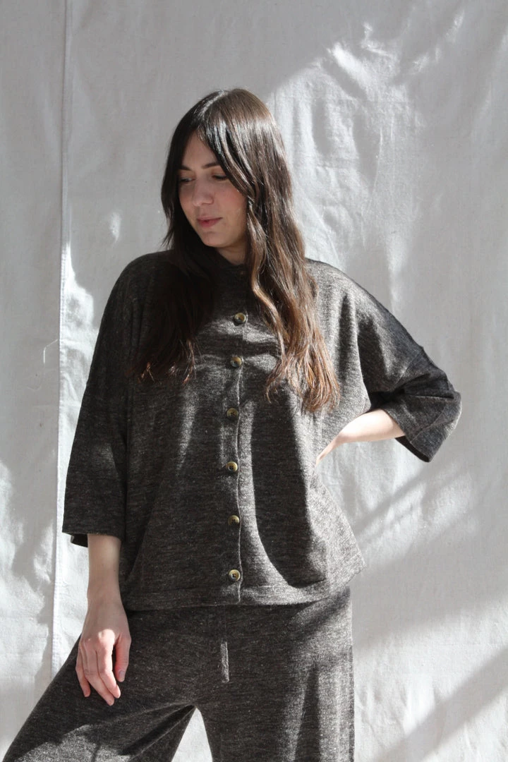 Boxy collar shirt with button front in a fine weight alpaca, linen. Washed finish.