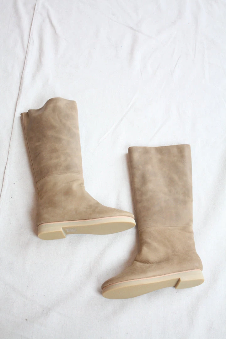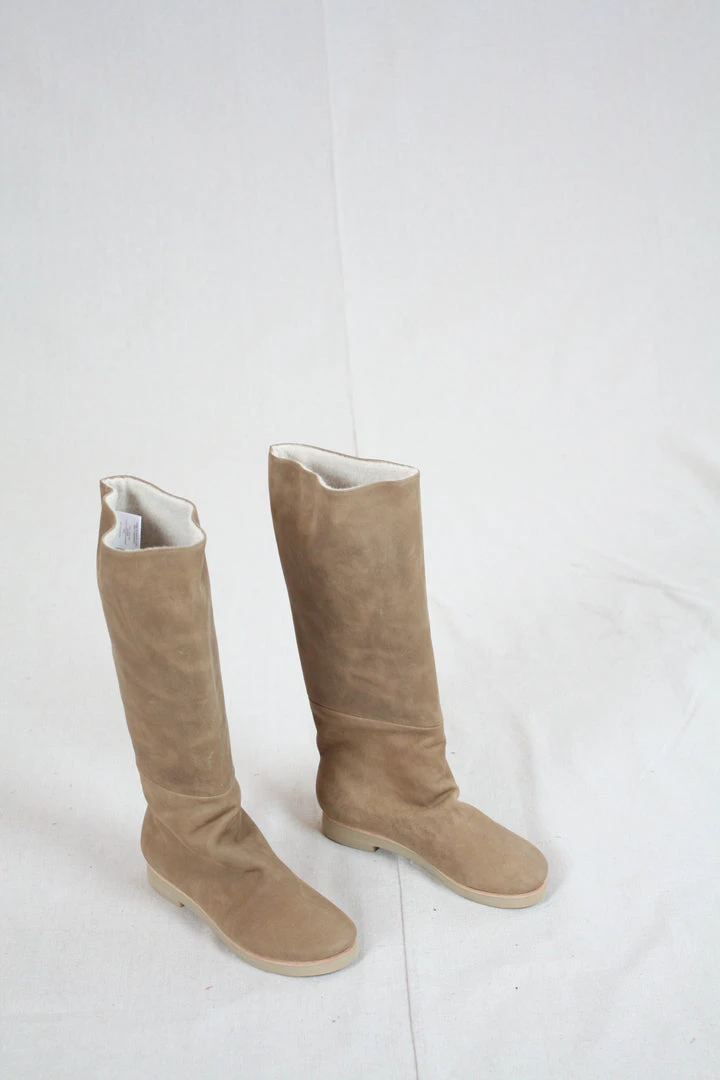 Tall pull on boot. Vegetable tanned leather upper, brushed alpaca liner and natural rubber sole.