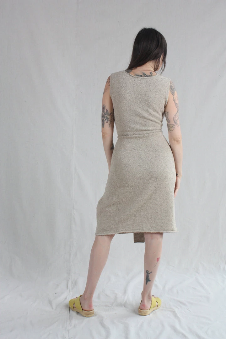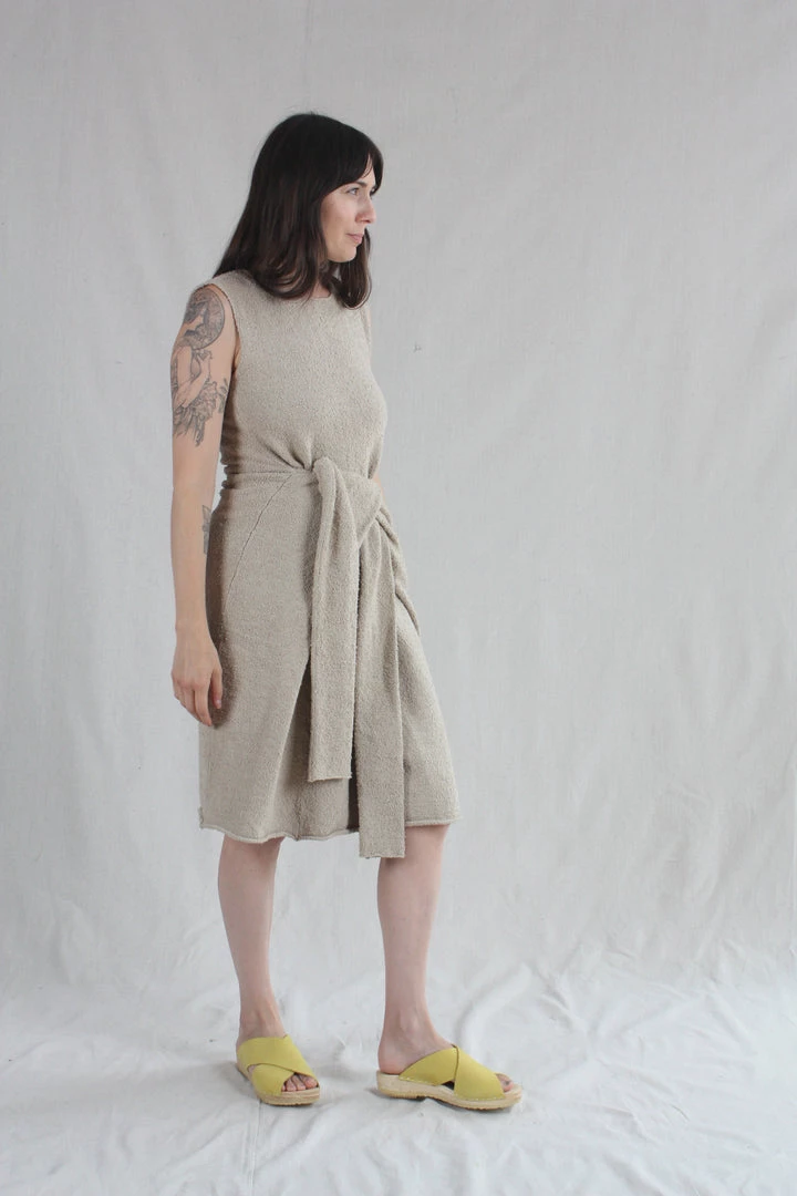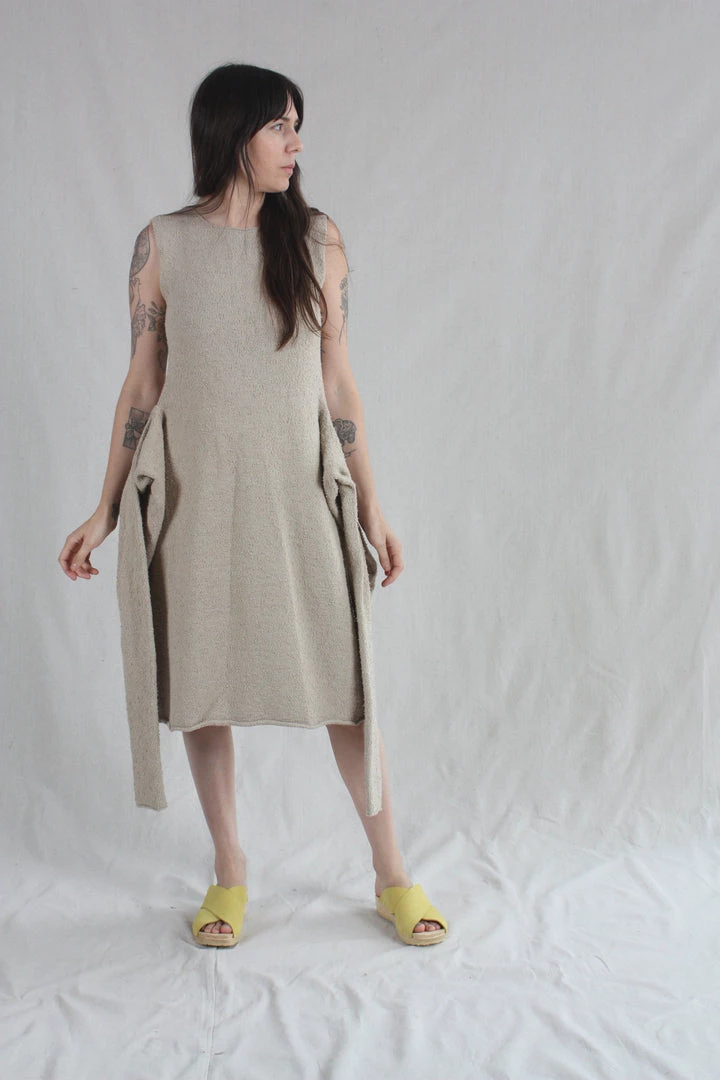 Scoop neck tank dress in a tight textured boucle with lycra for stretch. Adjustable tie panels at waist.Â