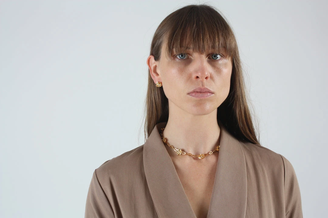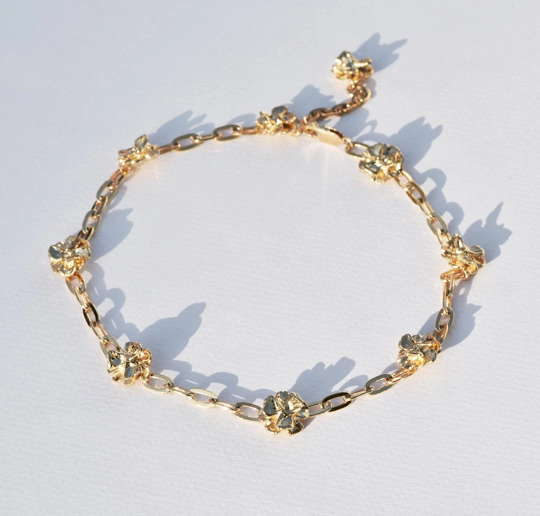 Individually cast poppy flowers are set between chain links in this subtle statement piece made of gold-plated brass. Great on it’s own or layered with other necklaces