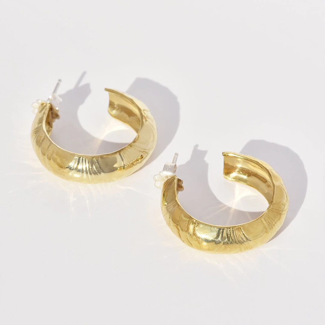 Marbled textures cover the surface of these brass hoops. Inspired by the ancient Turkish paper making technique, Erbu.ย