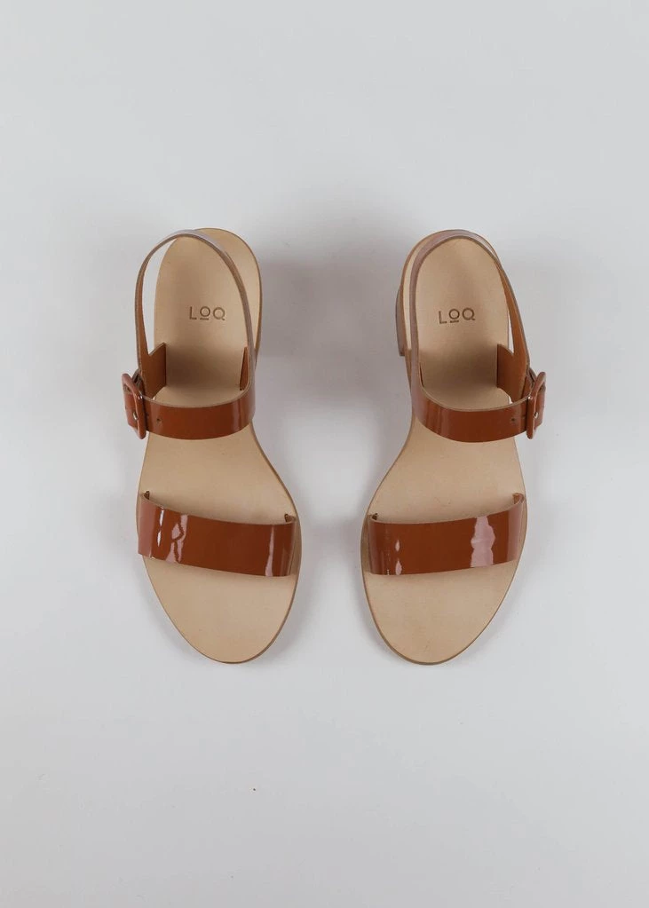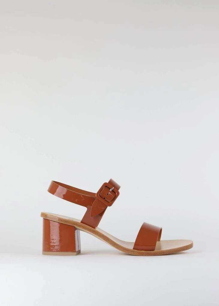 The Altea Sandal is sleek in patent leather featuring a simple strap across the toes and ankle strap with patent covered buckle.