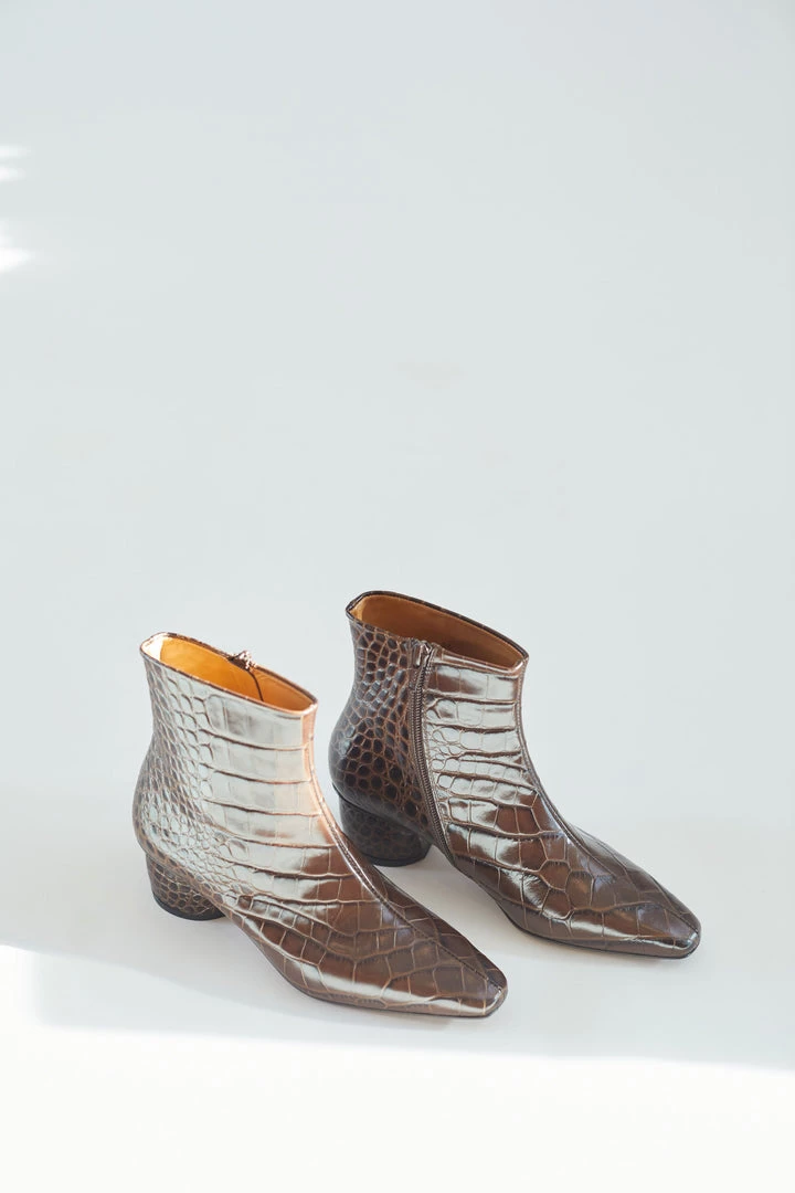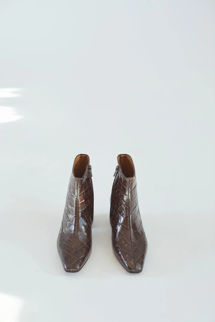 The Matea is an ankle boot in embossed brown leather with an almond toe. Oval heel covered in leather