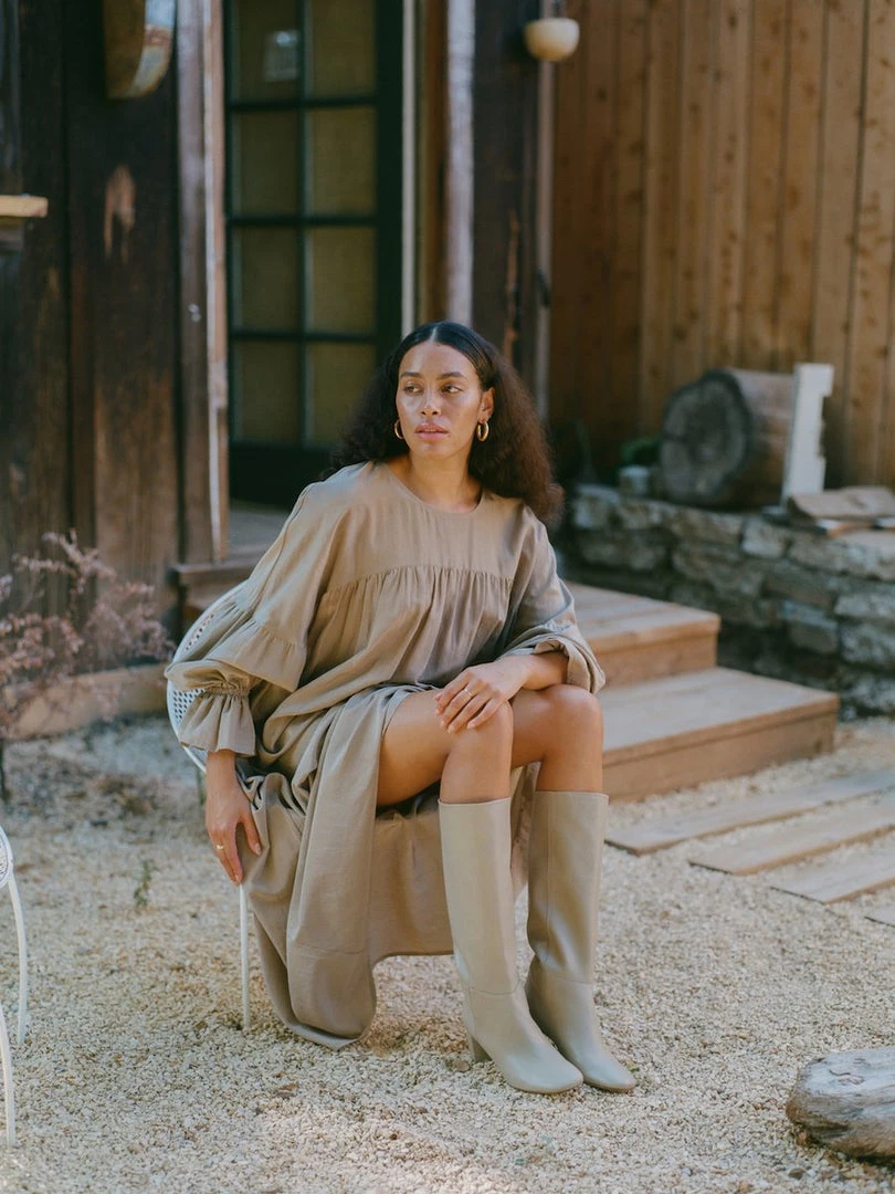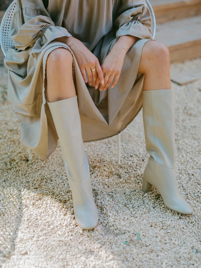The Donna is a tall pull-on boot in a supple grey leather that sits below the knee. Round toe and 2 ½” rounded block heel wrapped in leather. Padded leather footbed and leather sole.