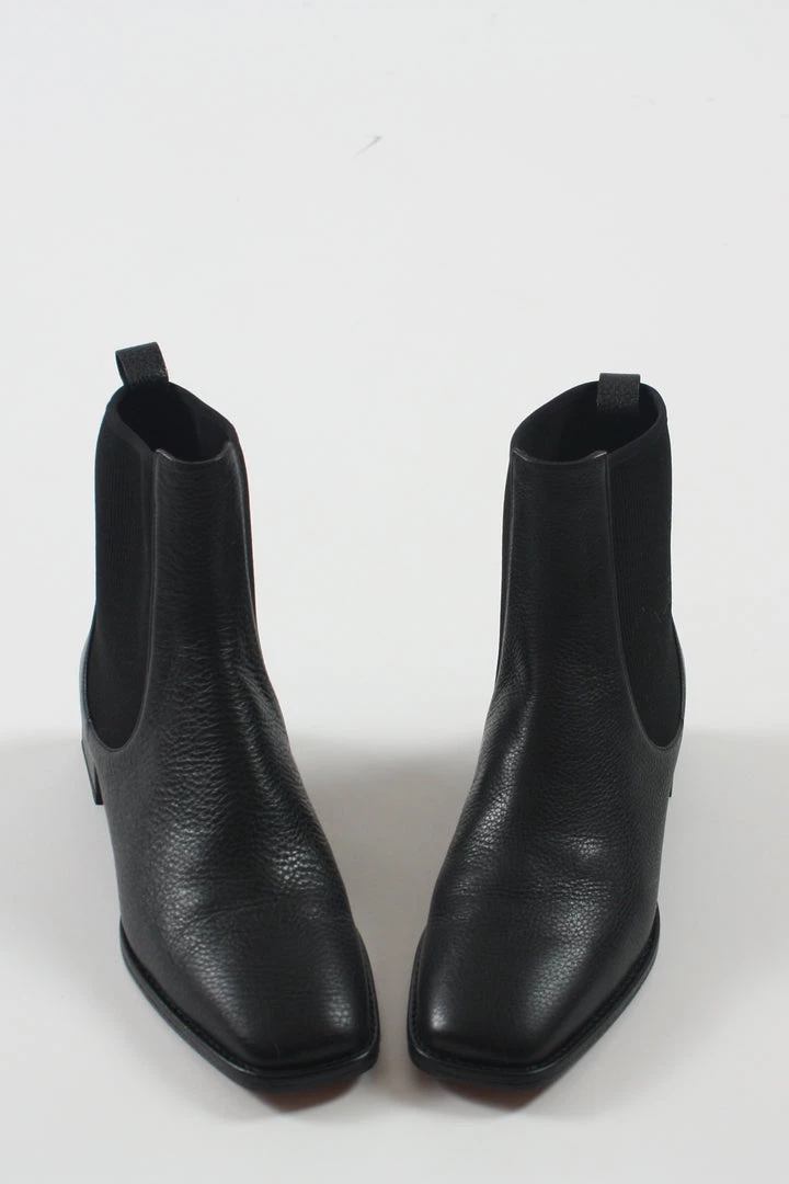 The Ottavia is Loq’s new pull-on chelsea boot featuring a square toe and elastic side panels in classic black leather. Covered block heel. Padded leather footbed and leather sole.
