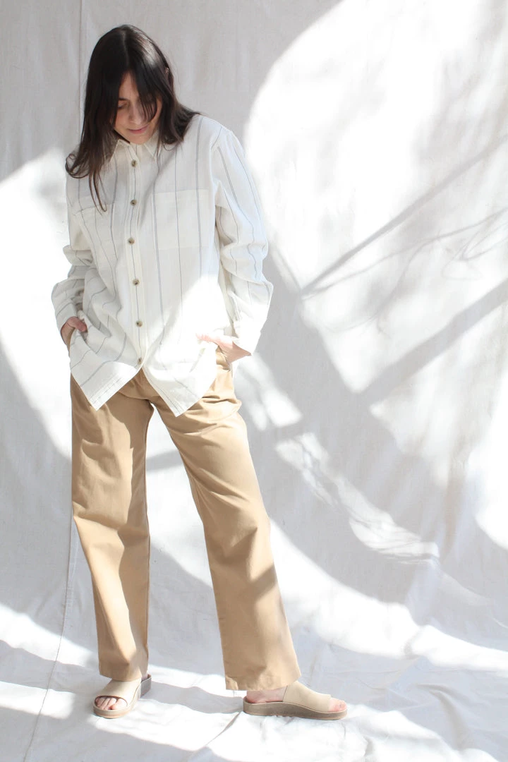 Adele is an oversized, menswear-inspired button-up with chest patch pockets and pleated, single button cuffs that land at the wrist. Throw it on as an overshirt with your favorite denim or pair with our Tulay Skirt. Made from a heavy-weight organic cotton and linen blend in our Polson Stripe pattern.