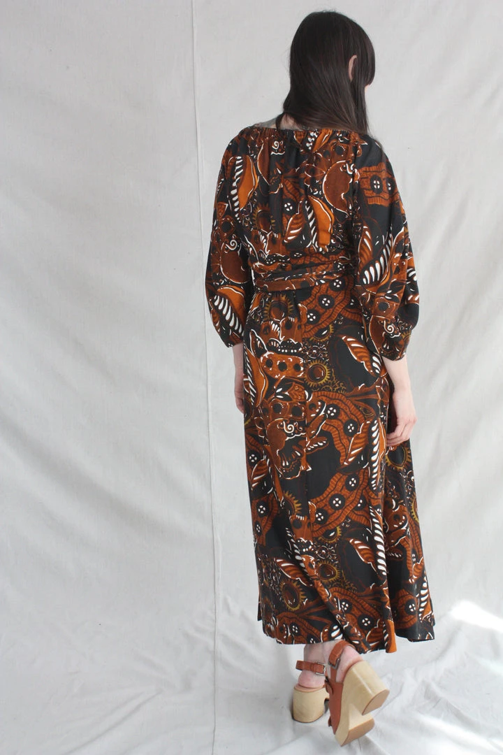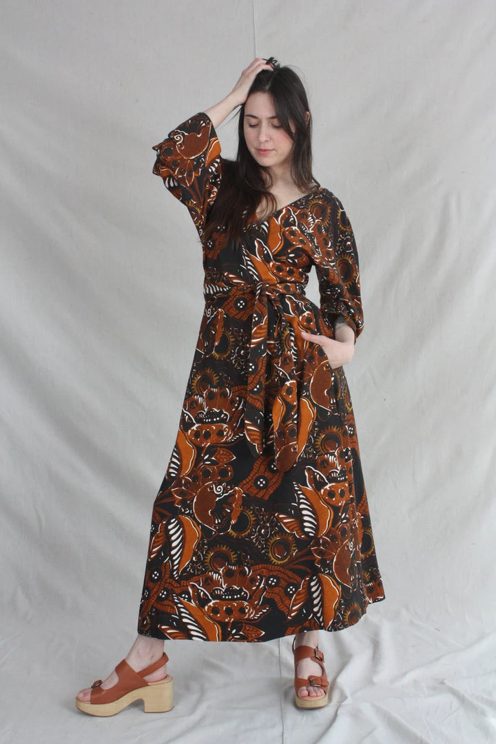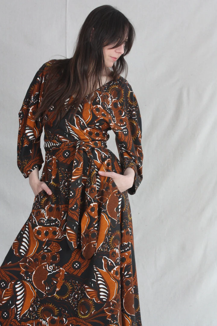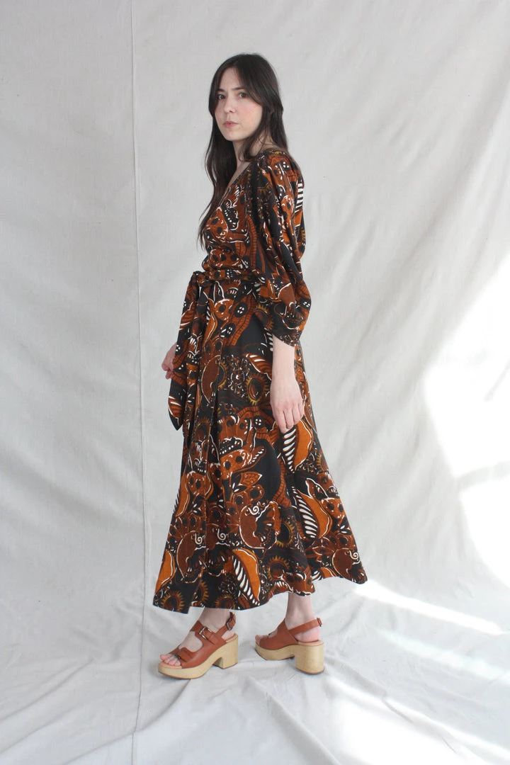 Agnella is a relaxed, A-line wrap dress with a V-neckline that can be worn on or off-the-shoulder. The self-tie belt cinches the waist, emphasizing the sculptural, bracelet-length sleeves and ankle-length skirt. Made from TENCEL™ Lyocell in our abstract Calaia floral print.