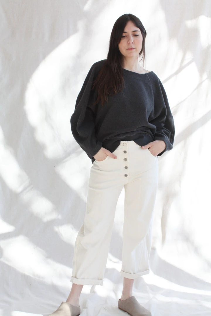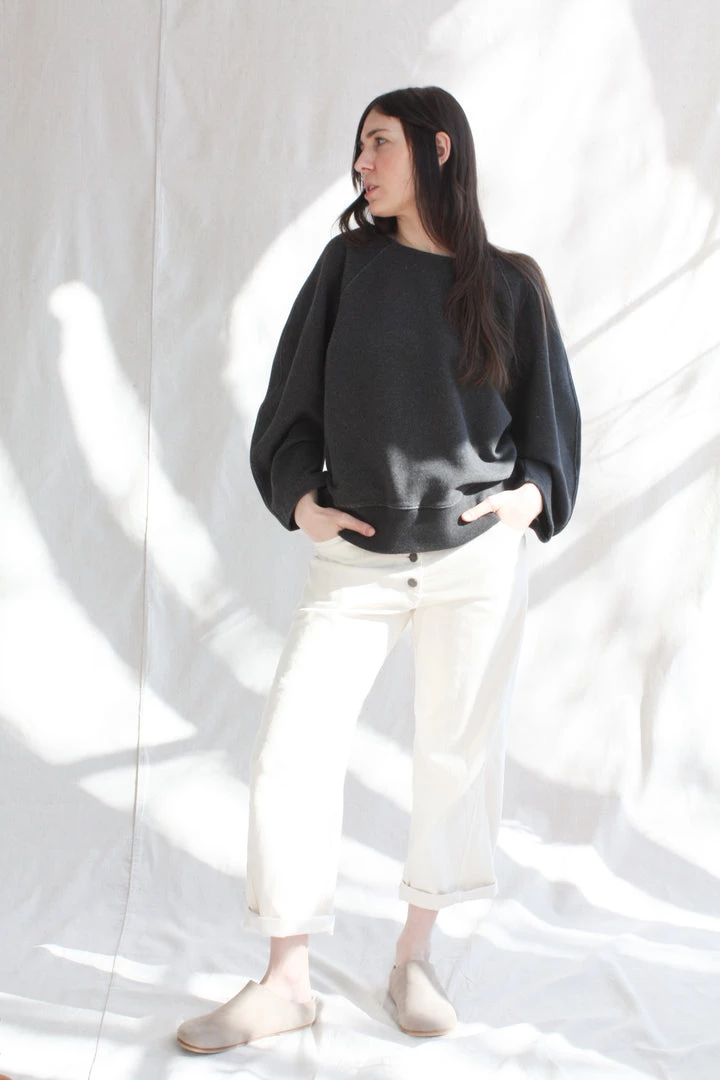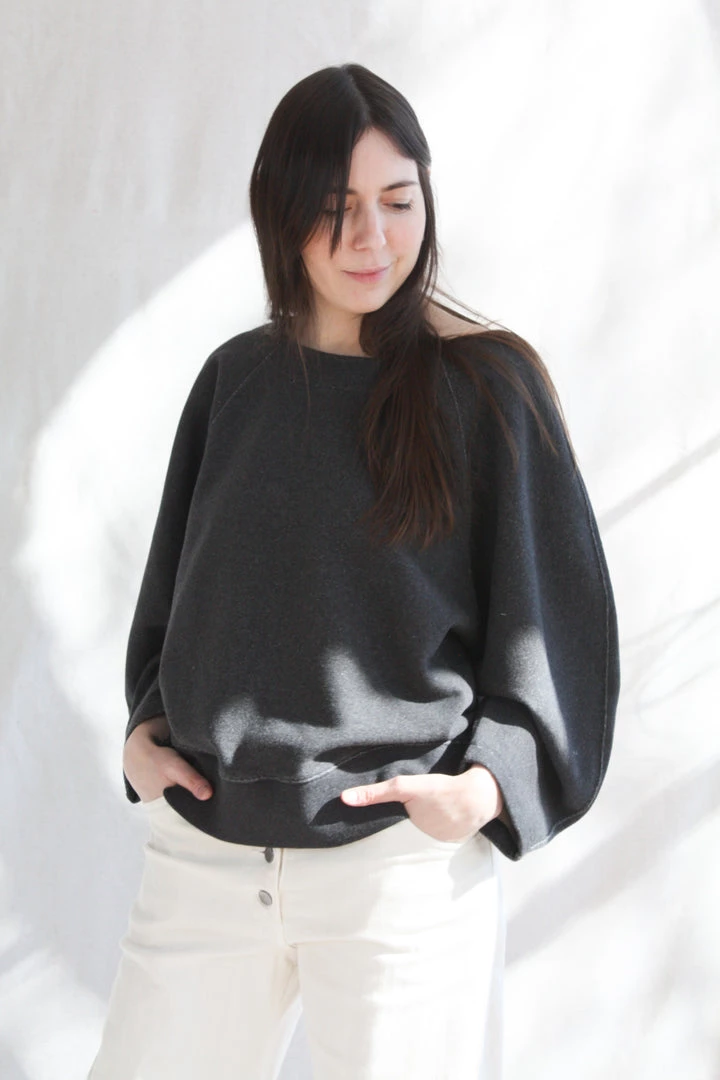 Blake is a full-length raglan sweatshirt with a round open neck, oversized sleeves, and a fitted, ribbed hem. Made from organic cotton and elastane
