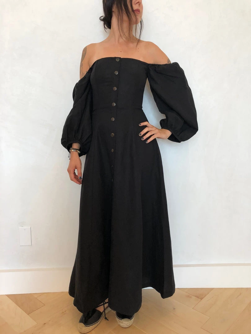 Marlow midi dress in black. Fitted bodice with boning and full 3/4 sleeves, which can be worn on or off the shoulders. Zipper at back. Bodice lined.