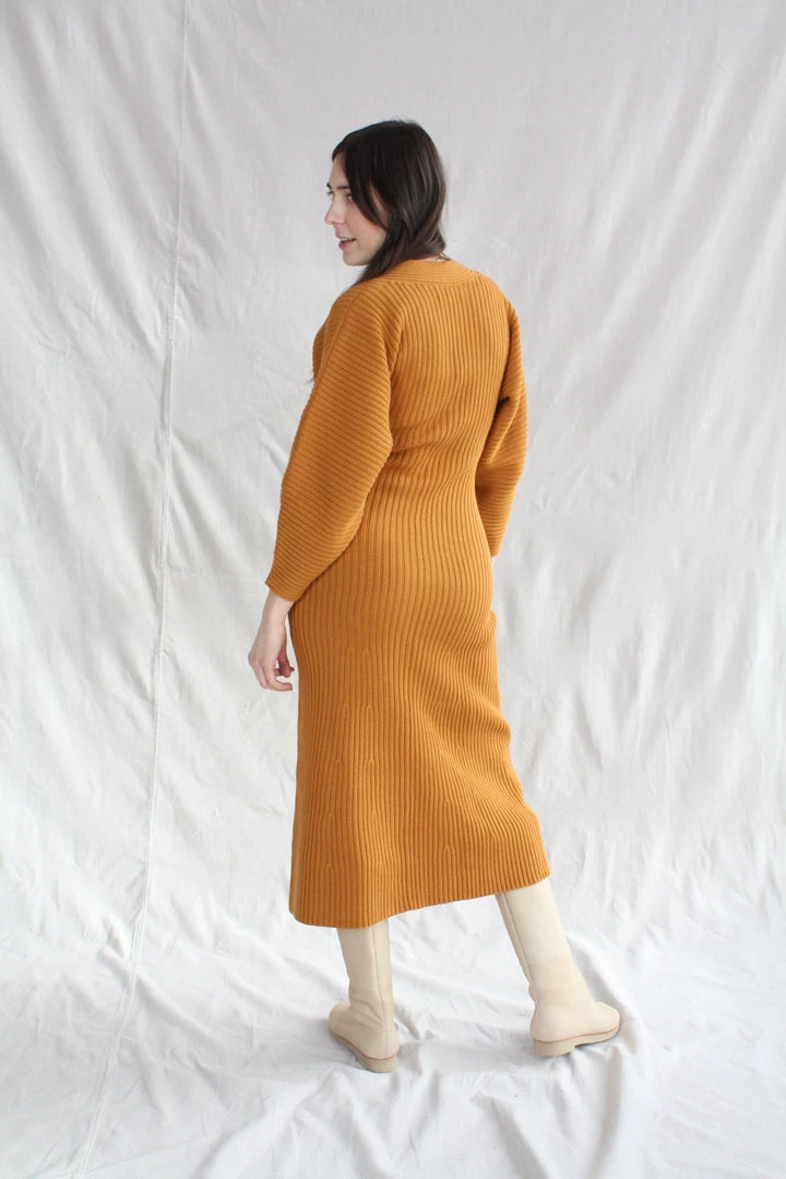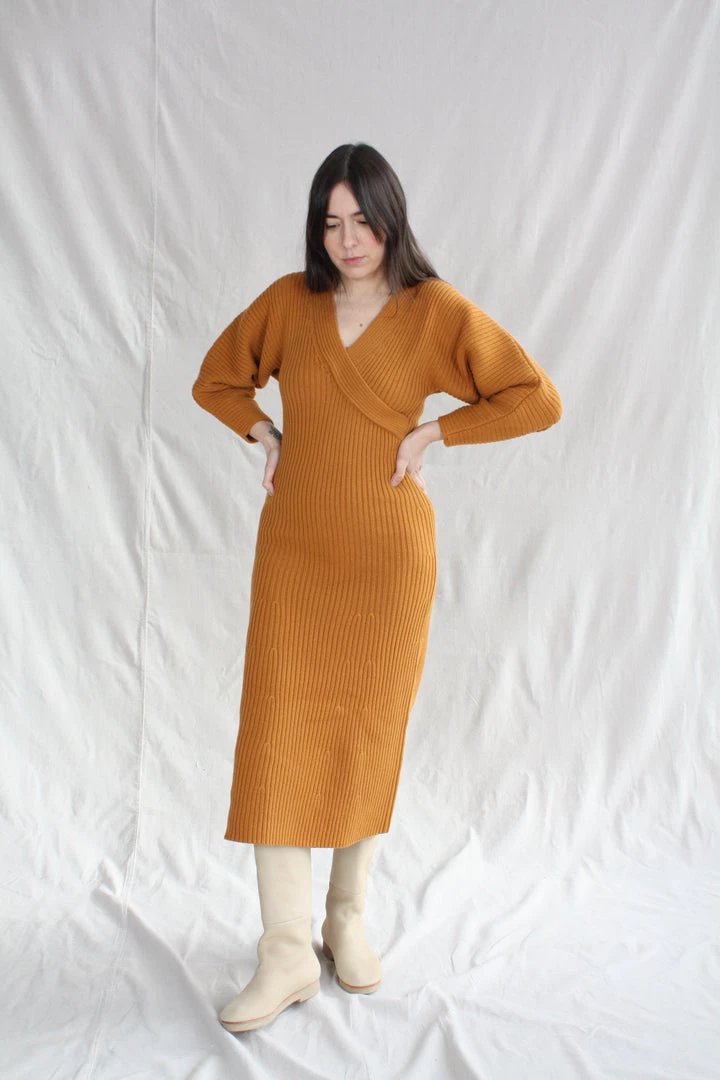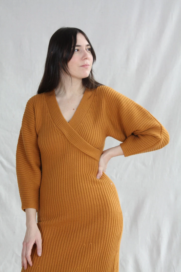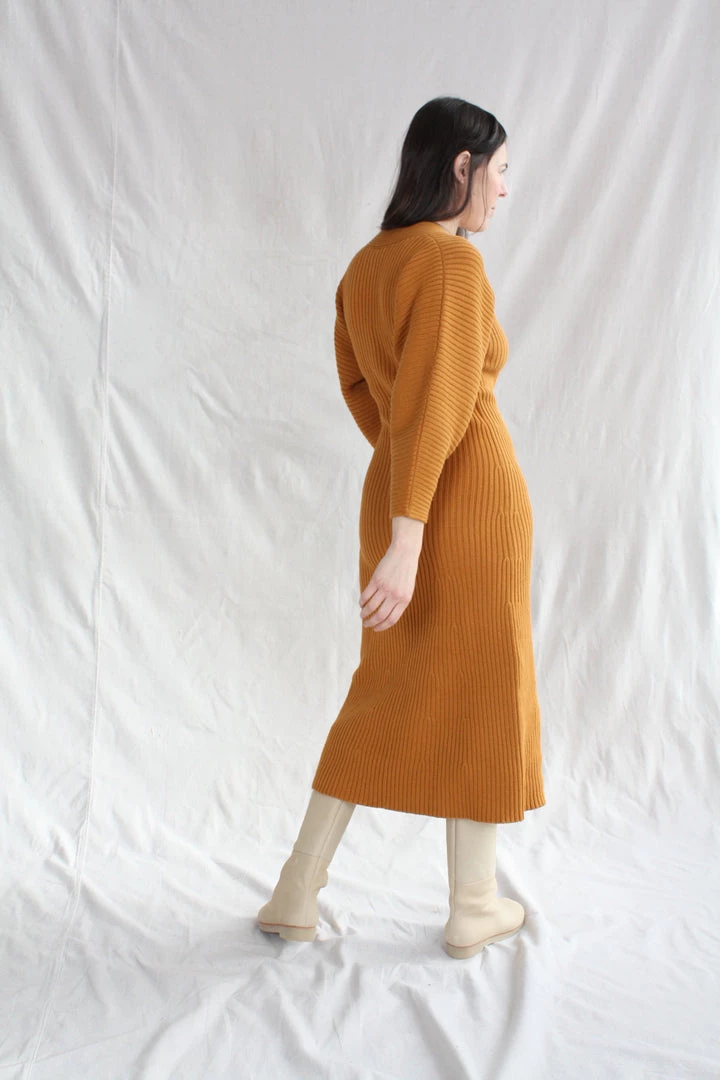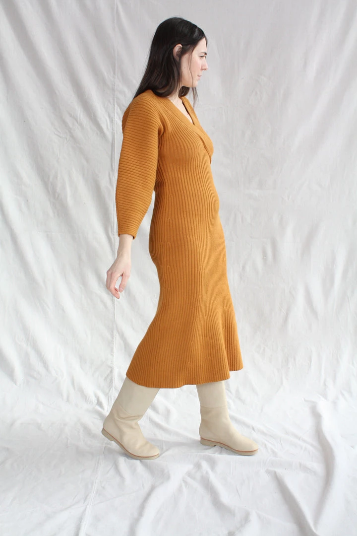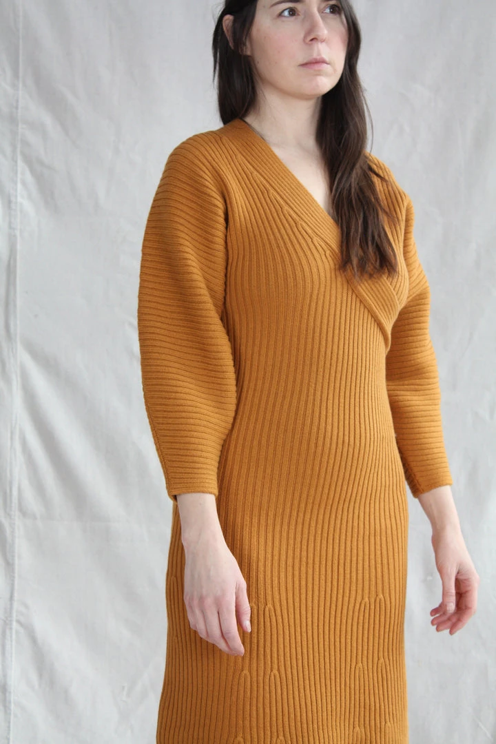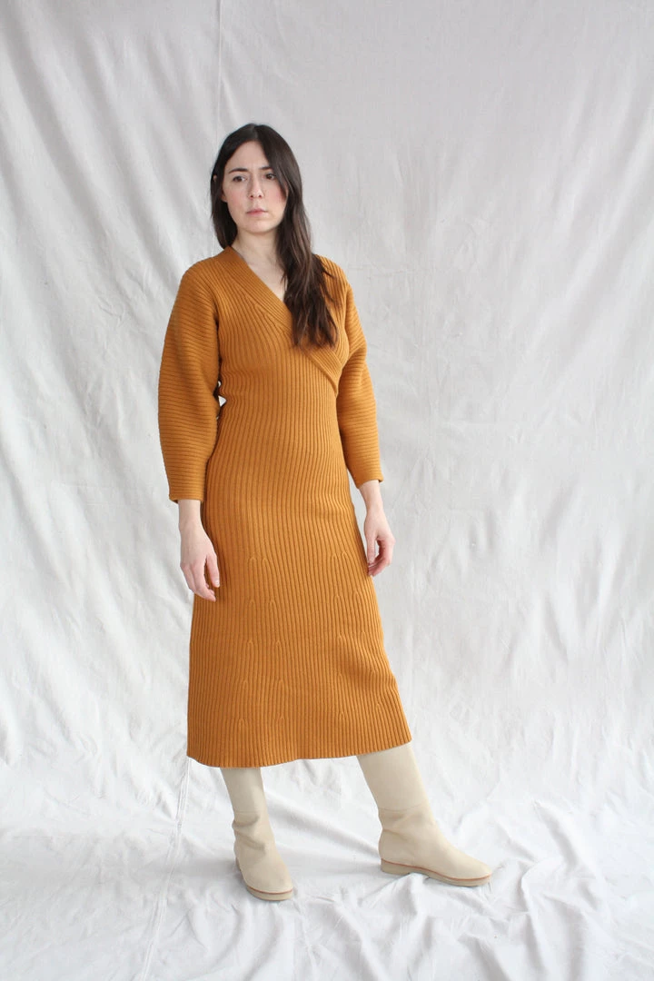 Samira is a fitted dress with a wide V neckline, round, sculptural sleeves, and a slightly flared skirt cropped at mid-calf. Knit from a soft, stretchy blend of organic cotton and Lycra™ with a ribbed texture.