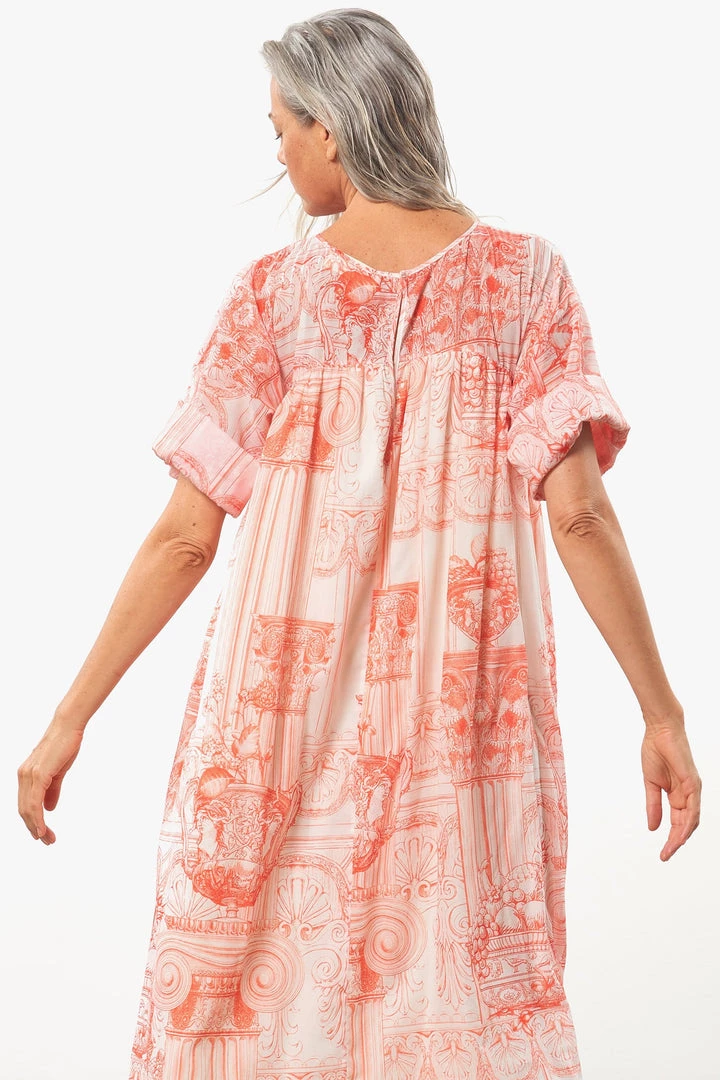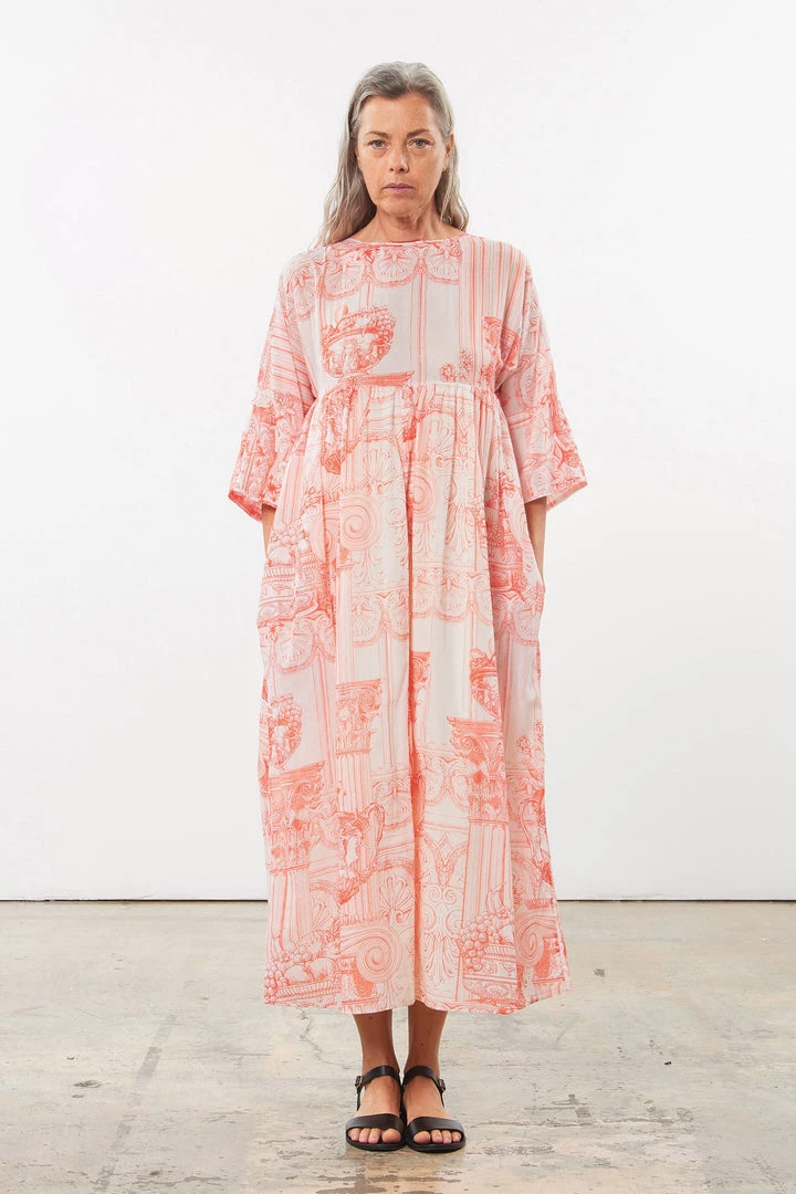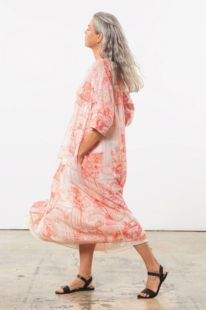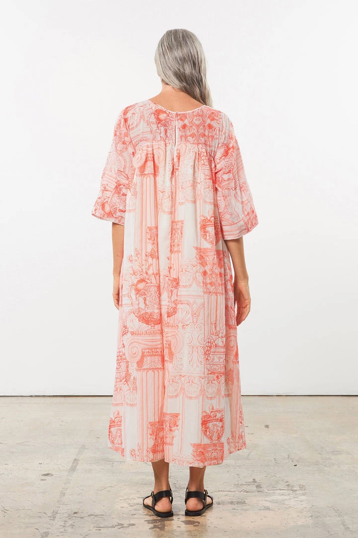 Relaxed dress with self-bound boat neckline, oversized drop-yoke bodice, and seamless ¾ length dolman sleeves with exaggerated facing for optional cuffing. Full, lined skirt with gathering detail at drop-yoke seam, cropped at ankle. Button-keyhole closure at rear neck. Made from lightweight cotton poplin with a hand-drawn, French toile-style print designed in-house exclusively for Mara Hoffman.