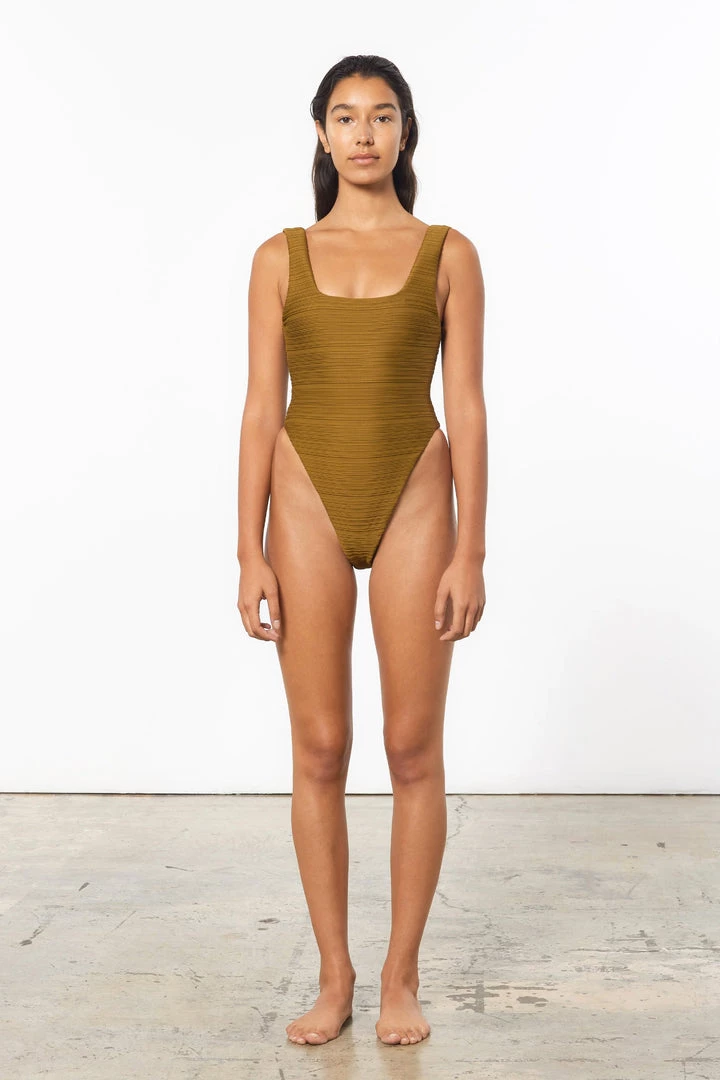 One-piece bathing suit with scoop neck, low open back, and high leg opening offering minimal coverage. Fixed shoulder straps. Made from pleated jacquard texture with UPF 50+ protection.