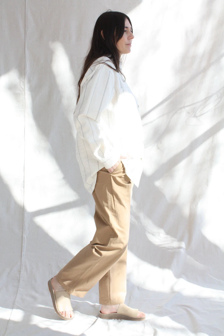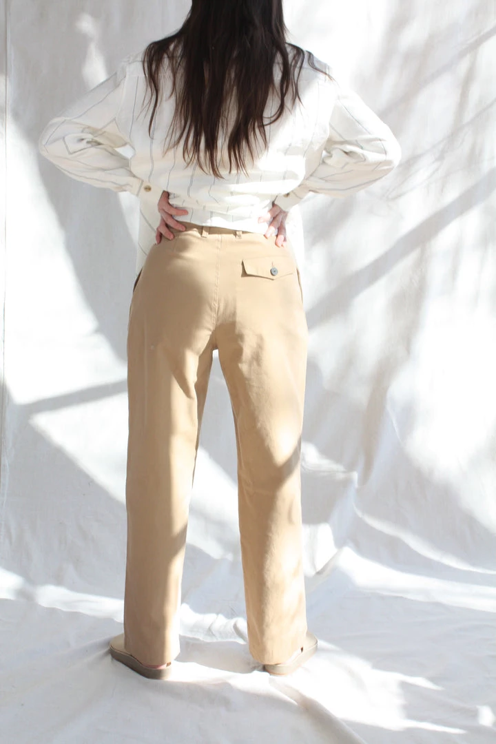 Monte is a pair of menswear-inspired chinos with a high waist and a loose, straight leg with extra length to be rolled or tailored. The pants are unlined with double front pleats, belt loops, side-seam pockets, a back flap pocket, and a zip fly with button closure. Made from recycled cotton.