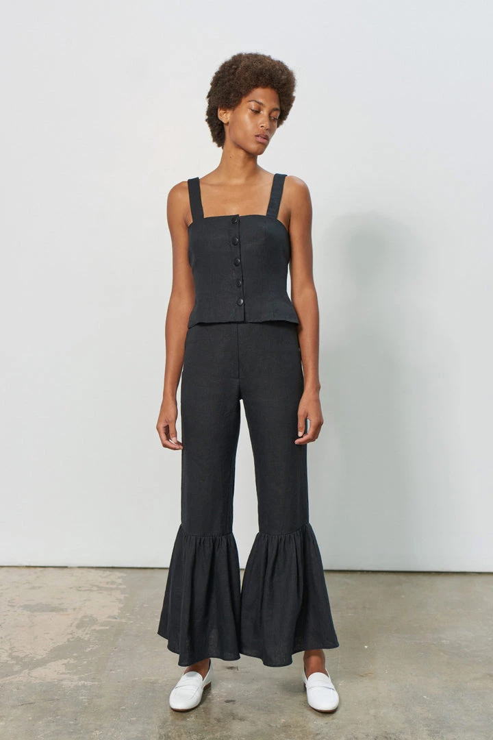 Piper cropped flared pant in black. Front zipper with button closure. This pant is made of 100% hemp, which is one of the most sustainable fabrics. This fabric will only get better over time!