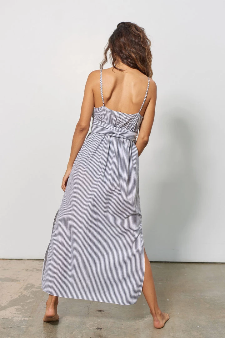 Wrap top dress in black and white stripe. Features button up skirt, adjustable spaghetti straps and side slits to mid thigh. Elastic waistband. Semi-sheer.