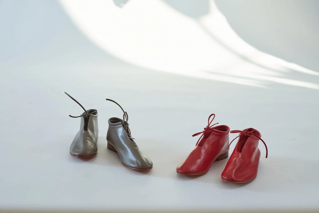 Handmade kidskin leather booties that fit the foot like a glove. Rounded toe and keyhole tie closure. Low stacked heel.