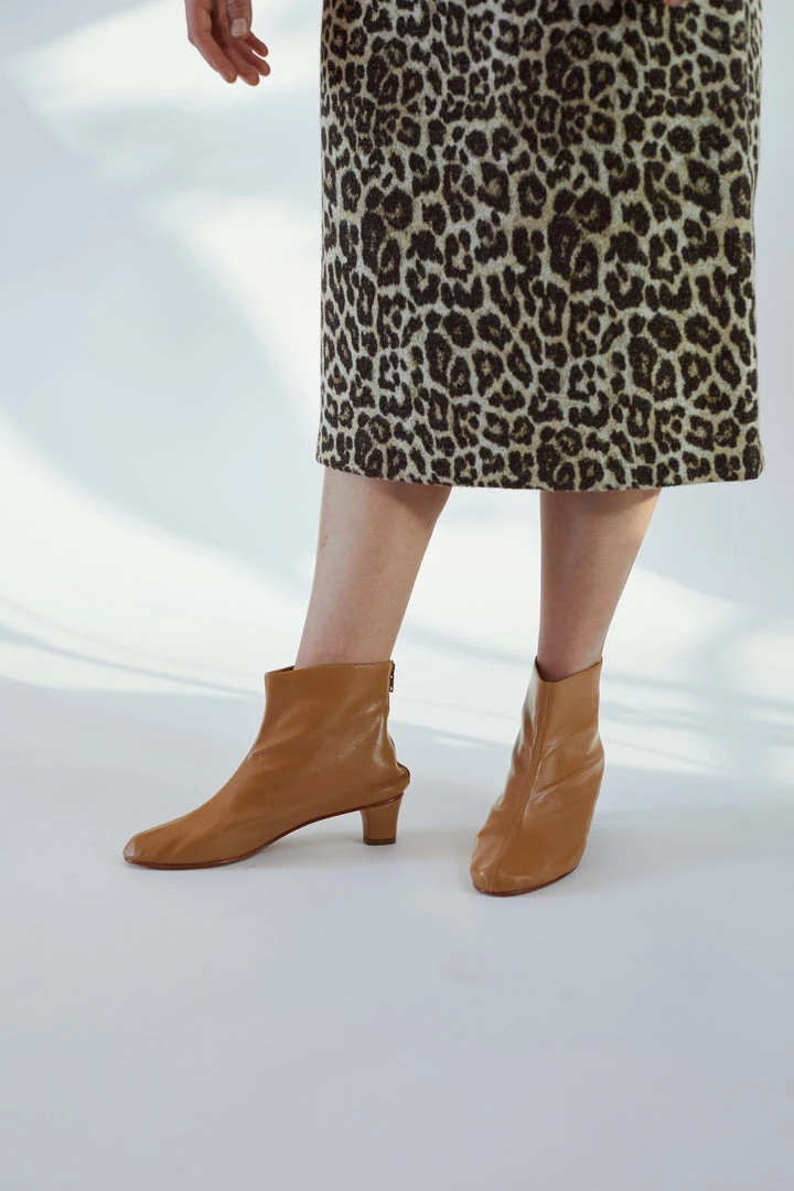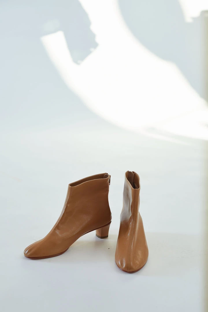 Handmade heeled ankle boots in soft kidskin leather that fit the foot like a glove. Rounded toe and leather covered heel. Back zip.