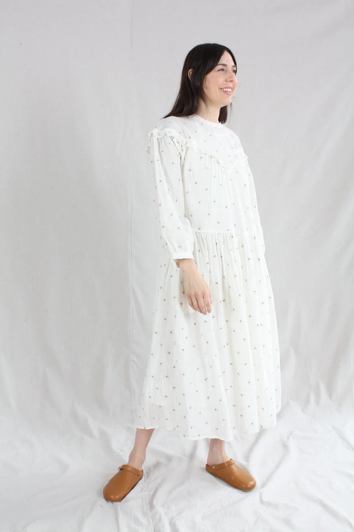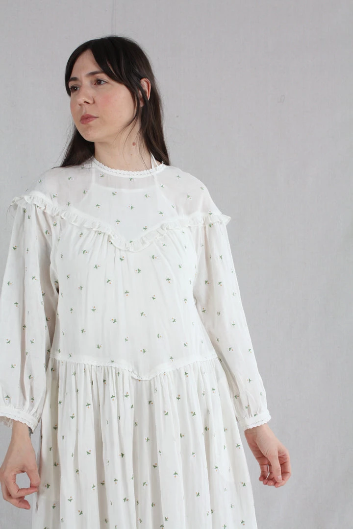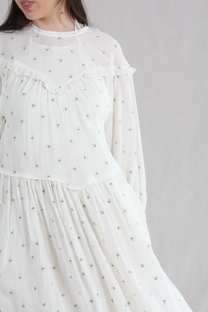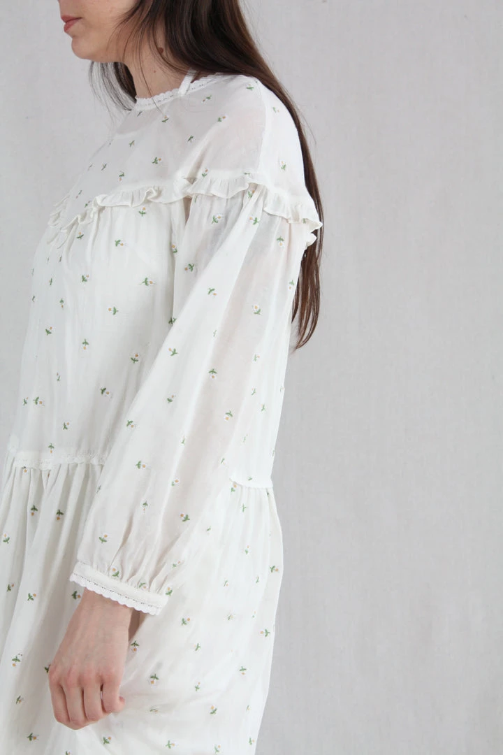 Knee length loose fitting dress with a round neckline fastened with a button at the back. With long sleeves and an elasticated cuff. In our Daisy Embroidery print on a white base.