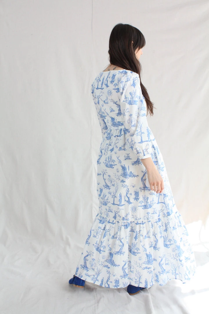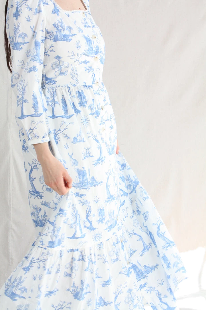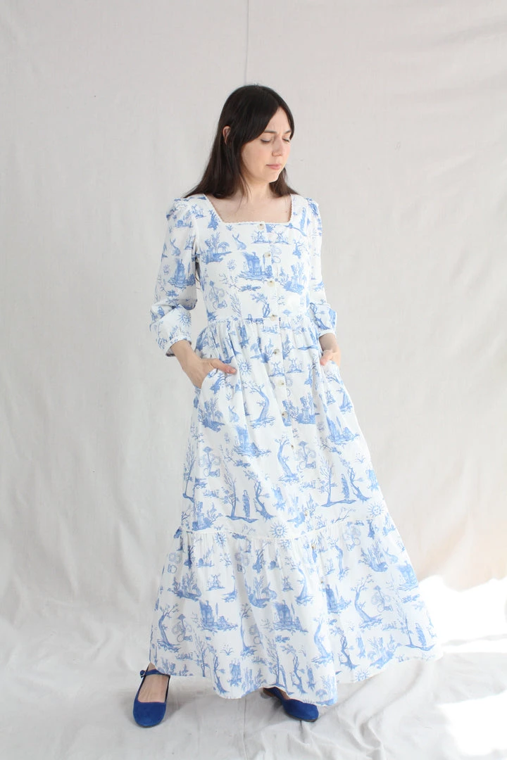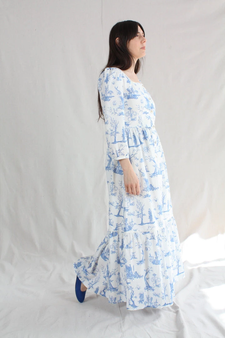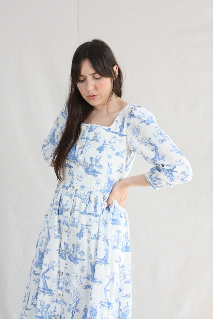 Maxi dress with a square neckline and buttons down the front. With 3/4 length sleeves. Gathered at the waist to create a full skirt.