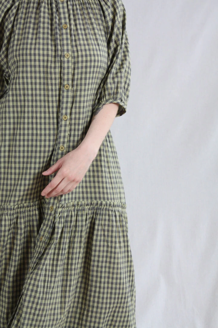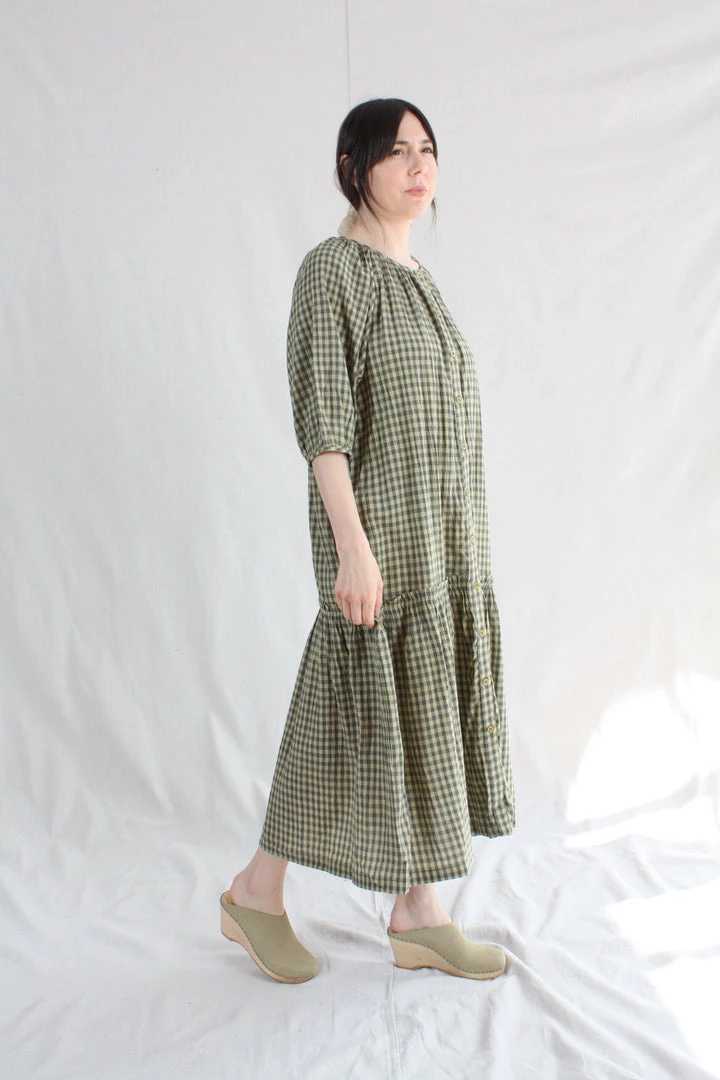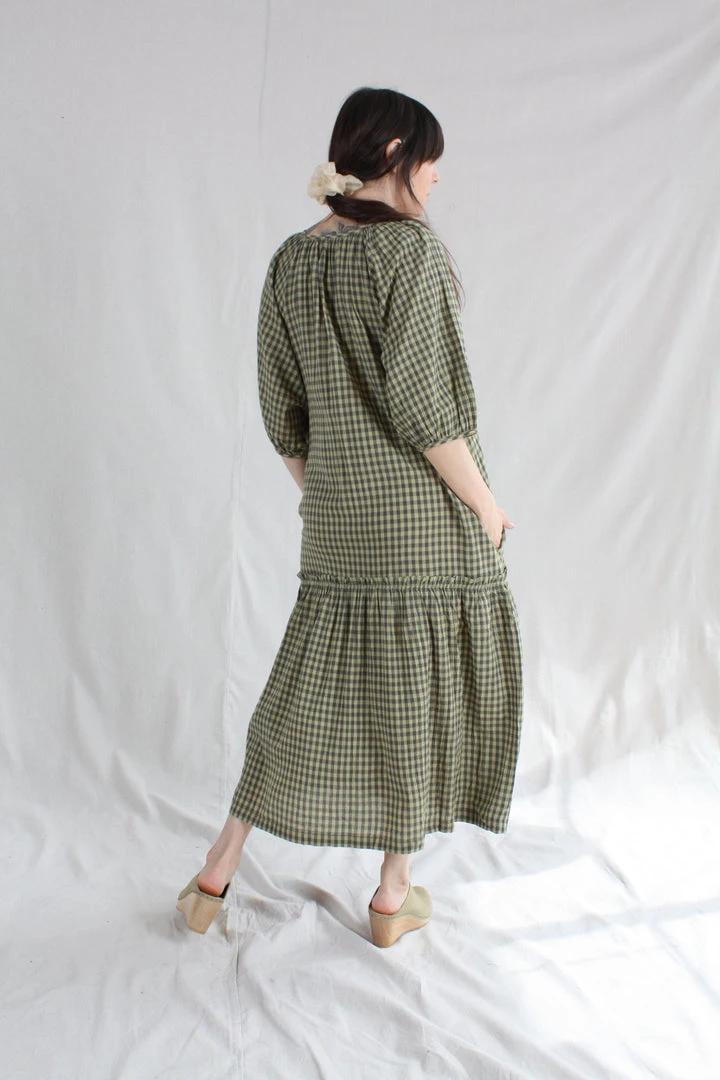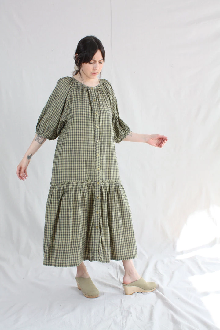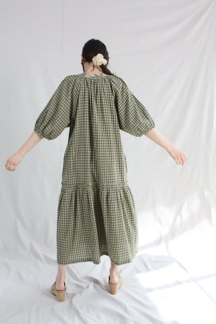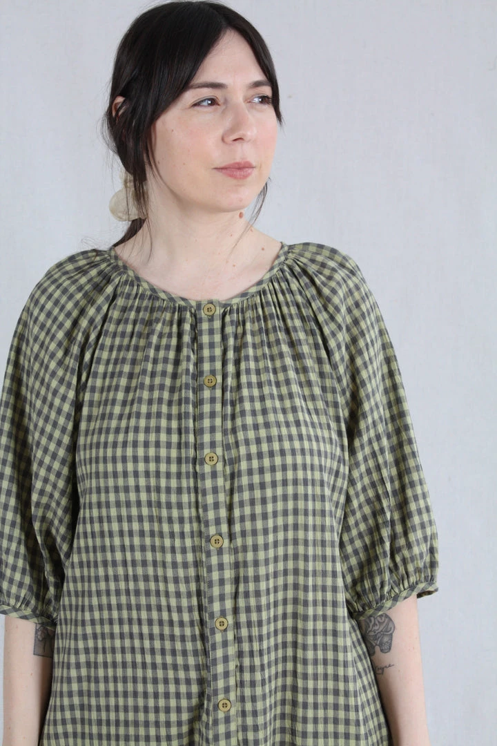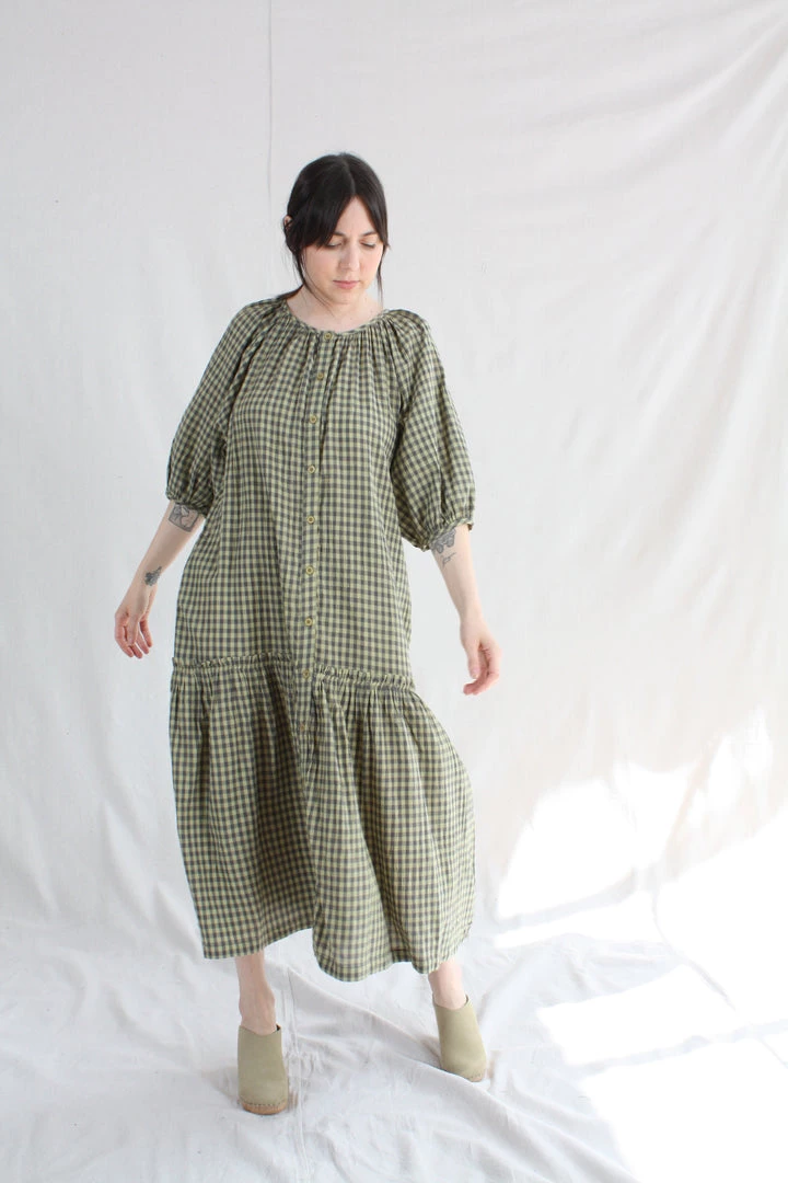 A feminine take on the classic shirt dress featuring a gathered neckline, raglan sleeve with a micro ruffle detail at the drop waist.