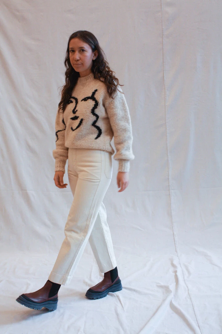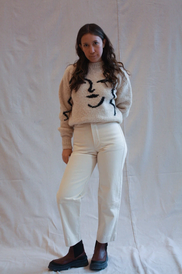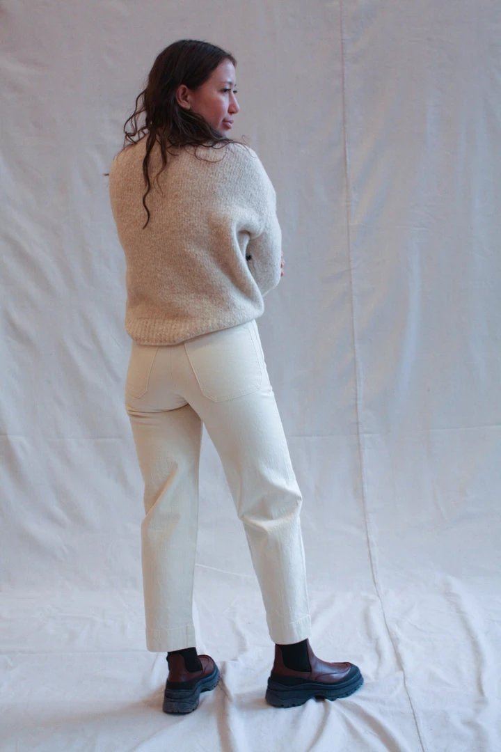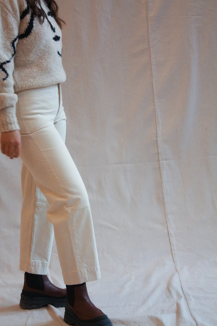 A straight leg jean with seamed panel below the knee. The pant sits at the natural waist, has a zipper and button closure and jean styling.