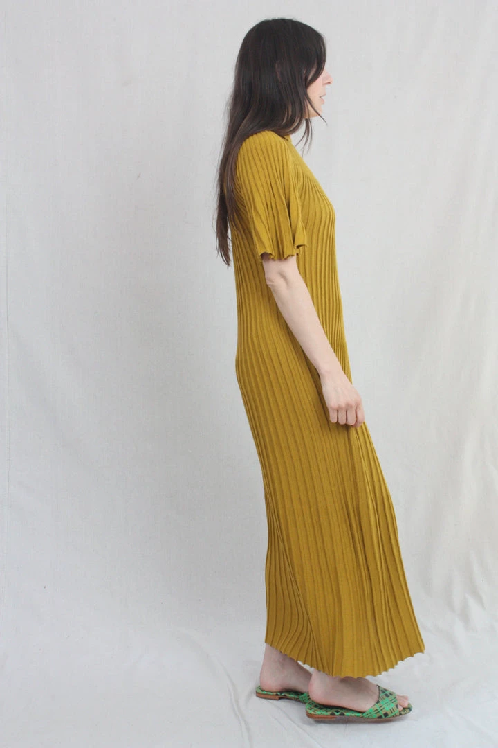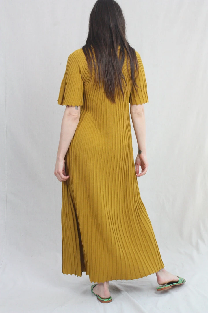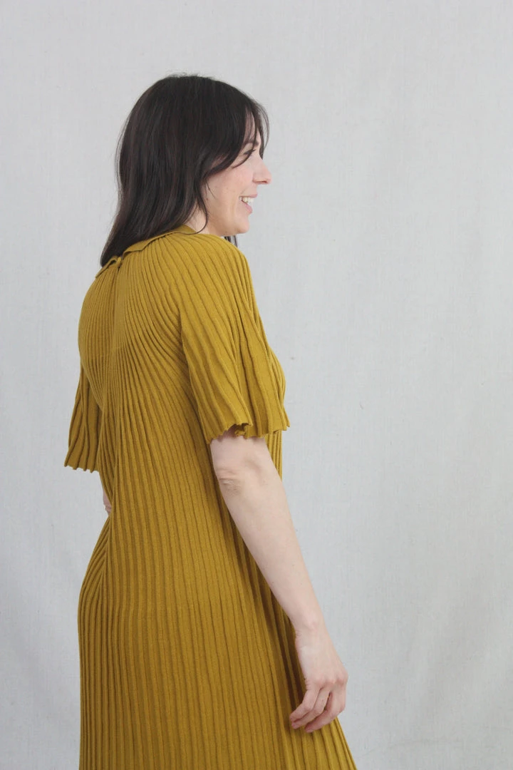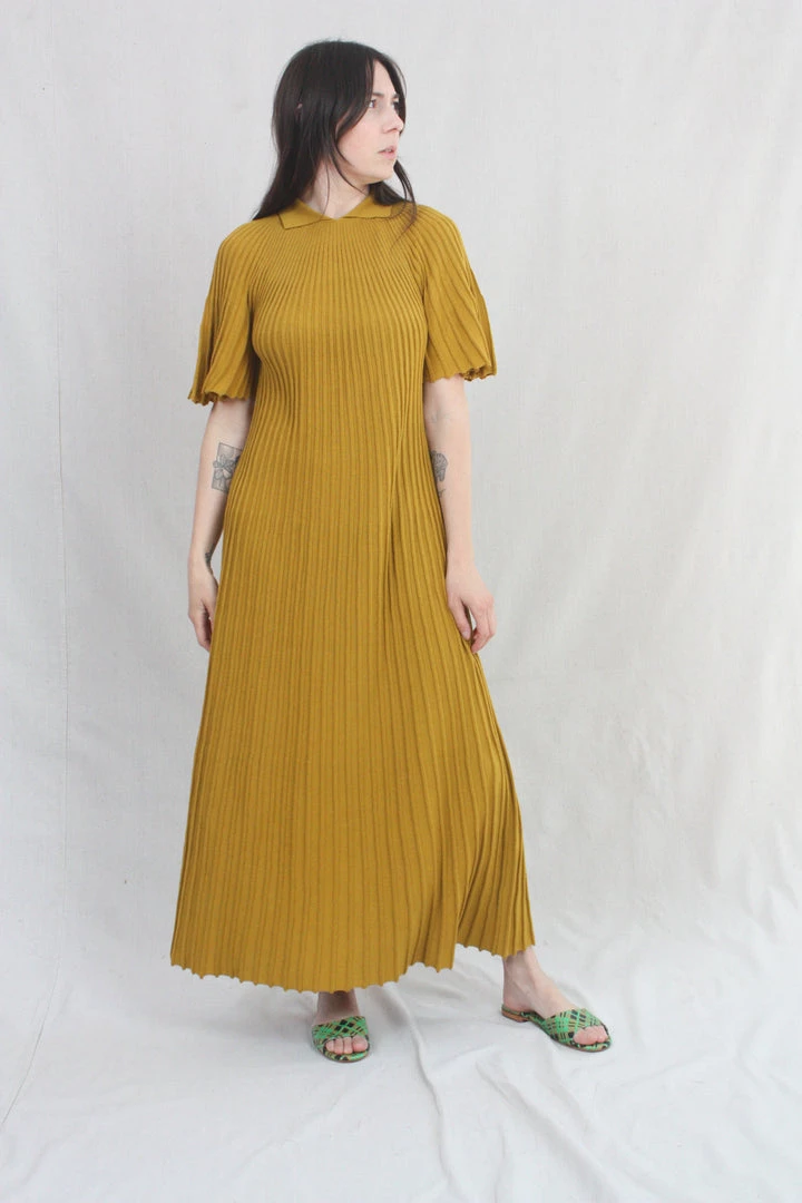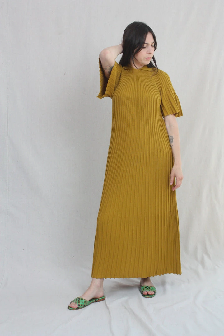 An elegant, airy dress featuring graduated knitted pleat widths and a soft collar with keyhole and crocheted button closure. The generous maxi length allows for daytime or event dressing alike.