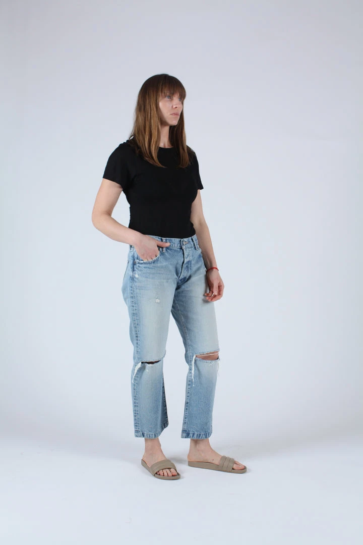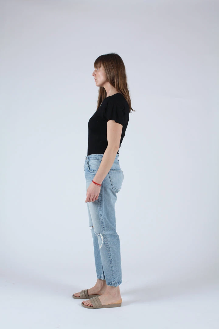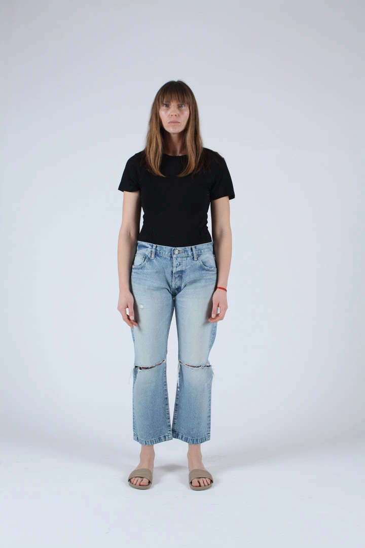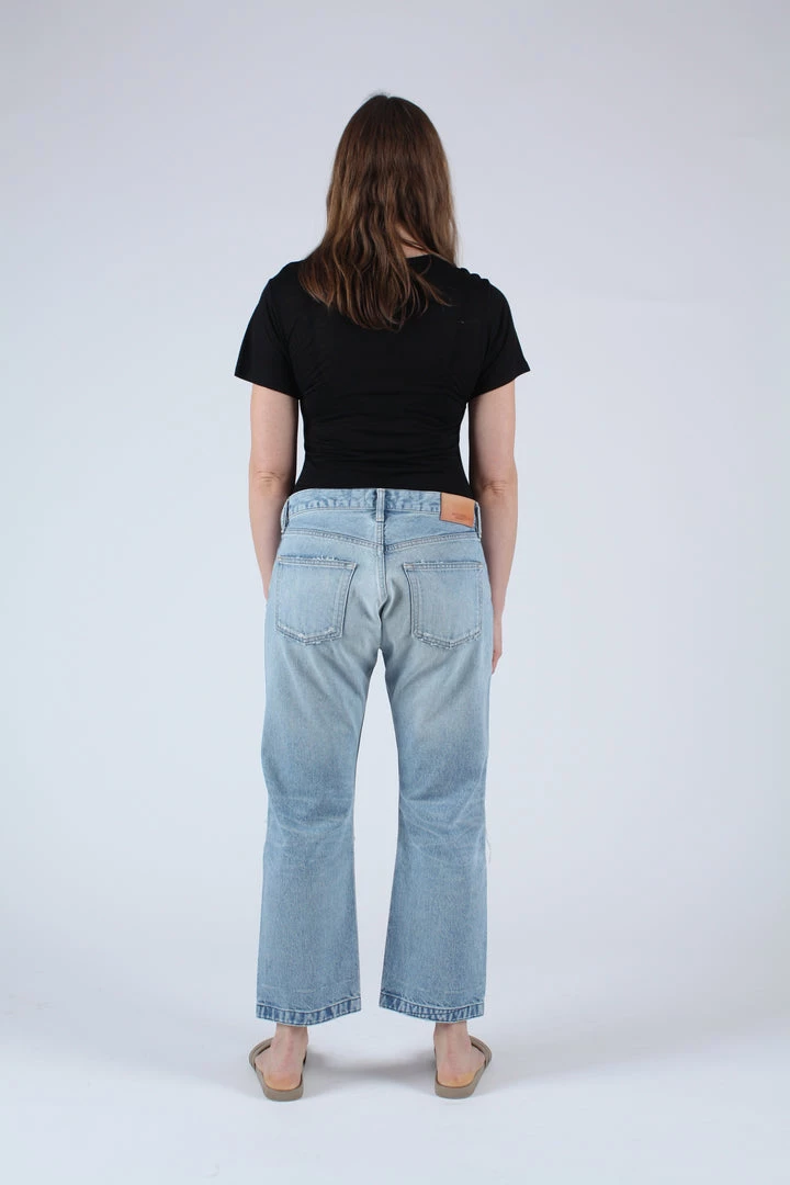 Mid rise cropped straight leg in light wash. Button fly and knee slashes.