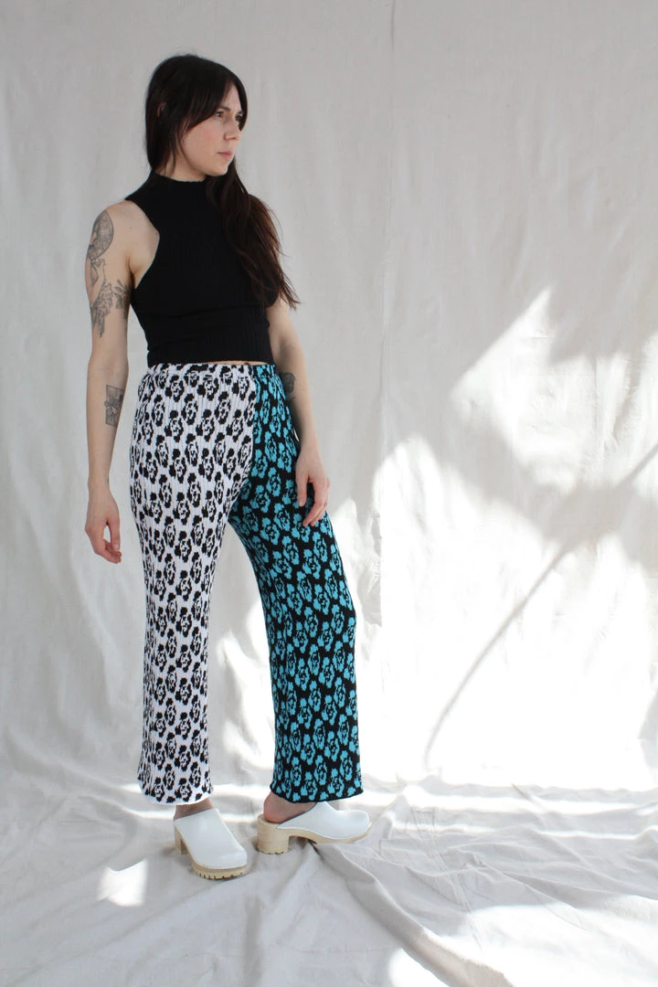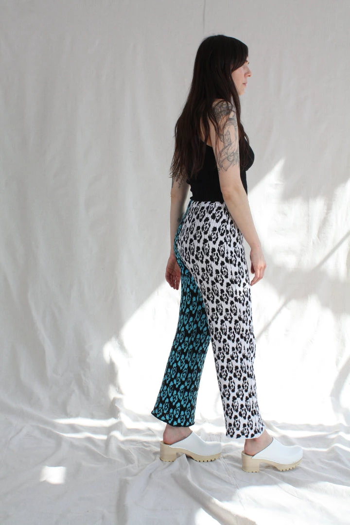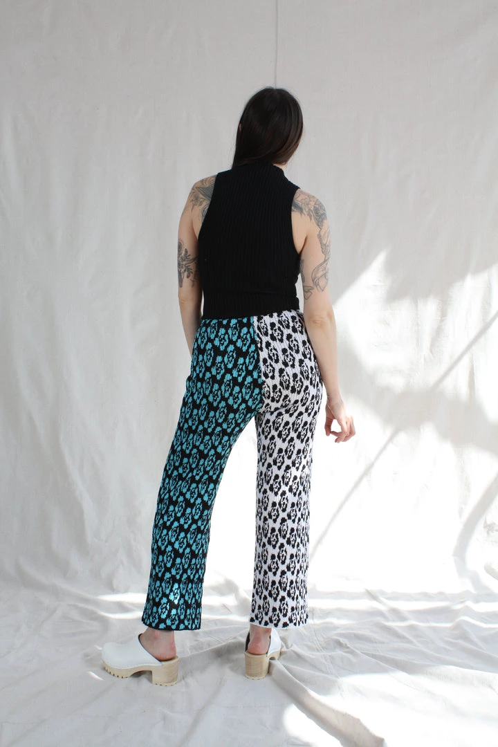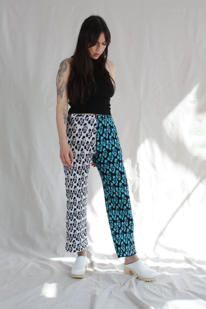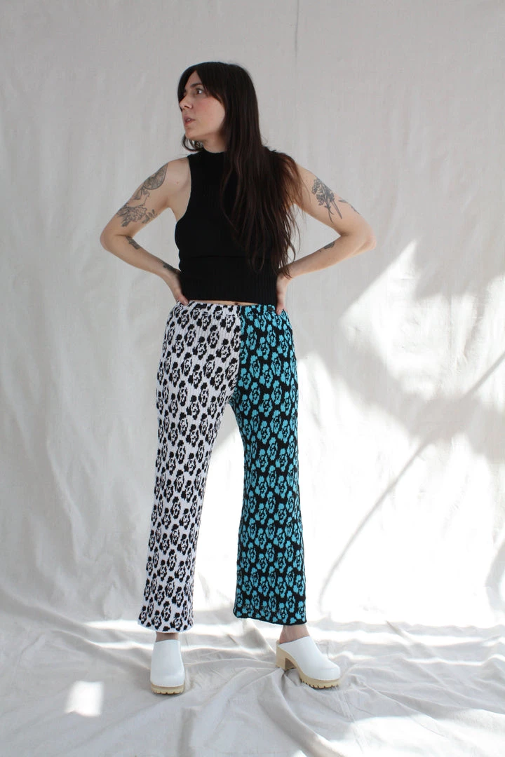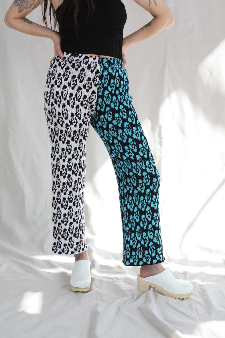 Handloomed knit pant in a color block rose floral. Highwaist with a slight flare leg. Elastic cord waist with toggle for adjustable fit.