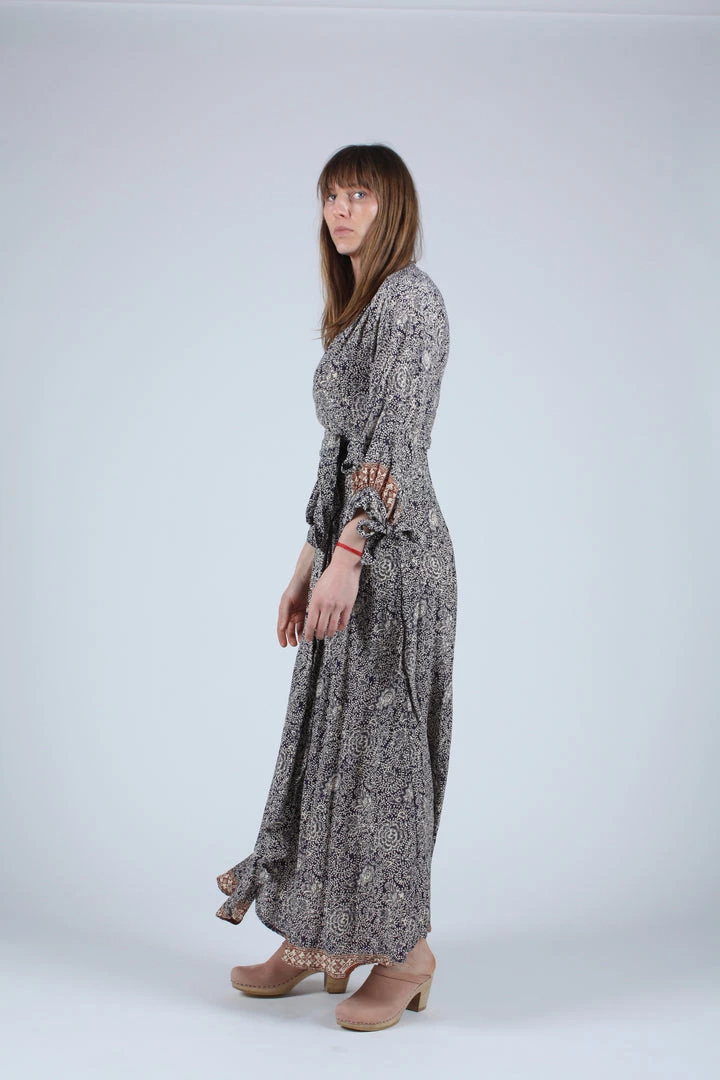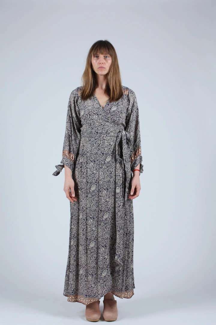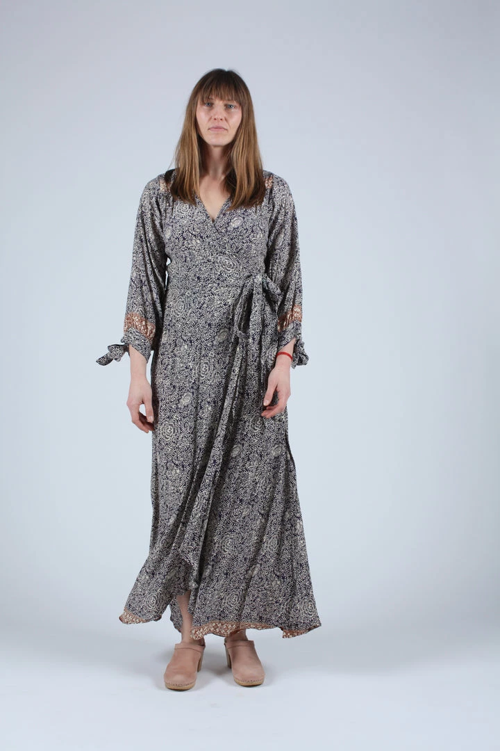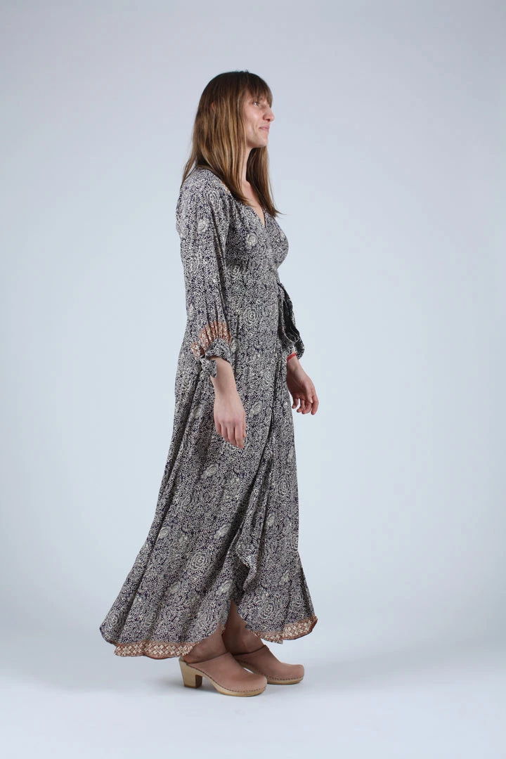 Maxi dress with asymmetrical hemline. Crossover bodice with wrap closure, forming soft gathers at mid section. Voluminous long sleeves with ties.