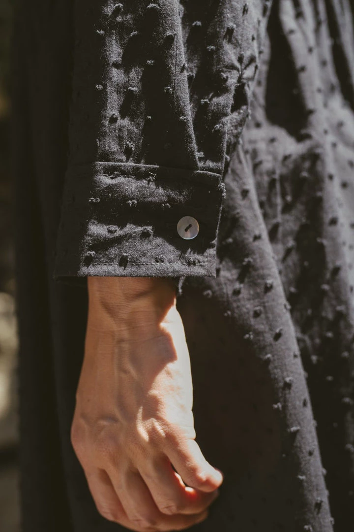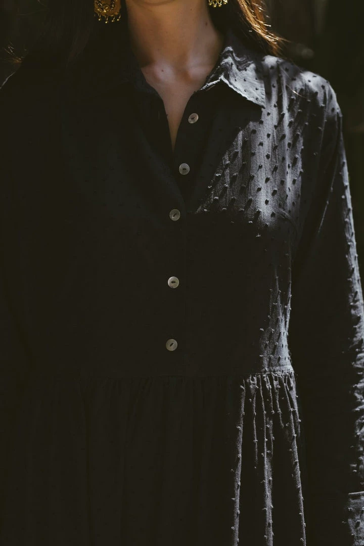 Maxi dress withย full sleeves and collared neckline. Button-upย bodiceย with shell buttons.ย Two front pockets and single tier at hemline.