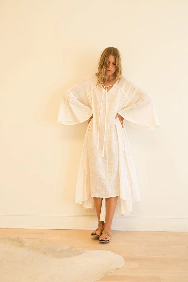 Cotton gauze maxi dress. Bell sleeves. Slits on side hit upper/mid thigh. Tiered back.