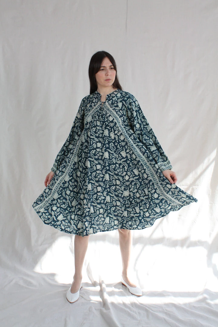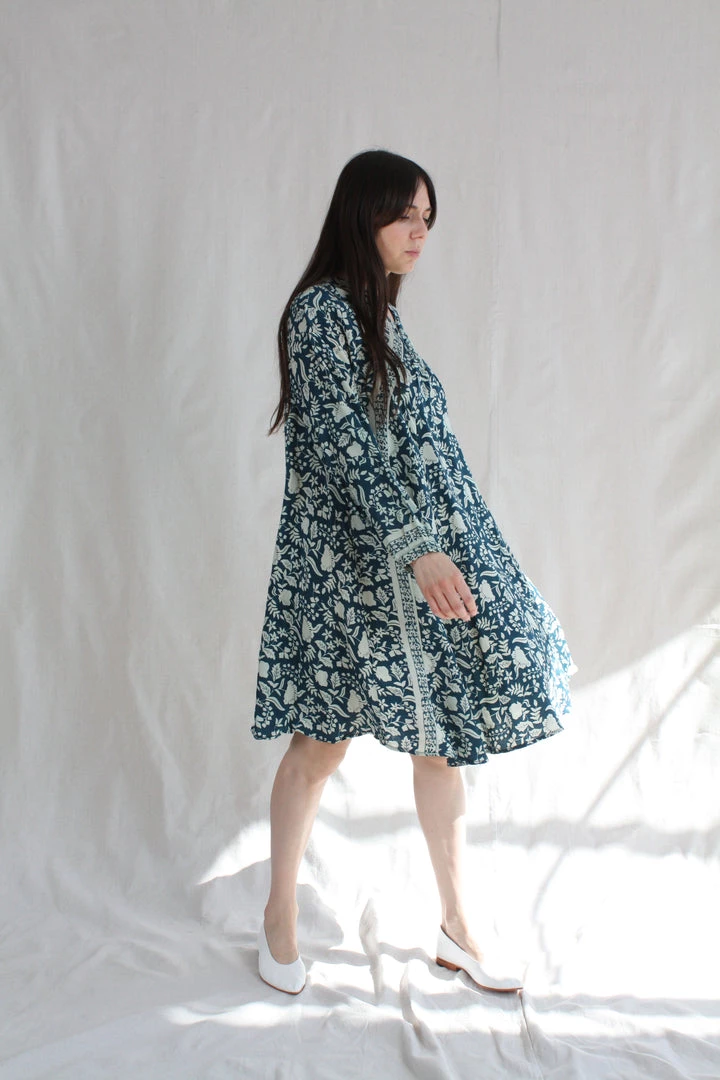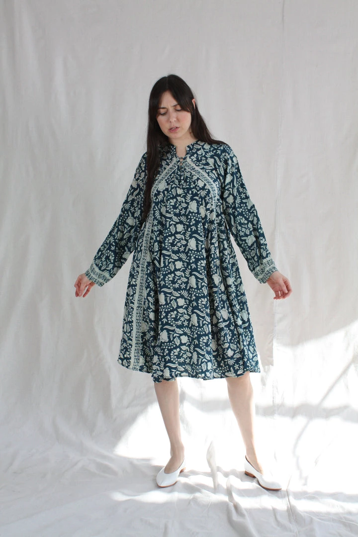 A-line cut and voluminous long sleeves. Deep v-neckline with covered buttons. Dress hits at or just above the knee.