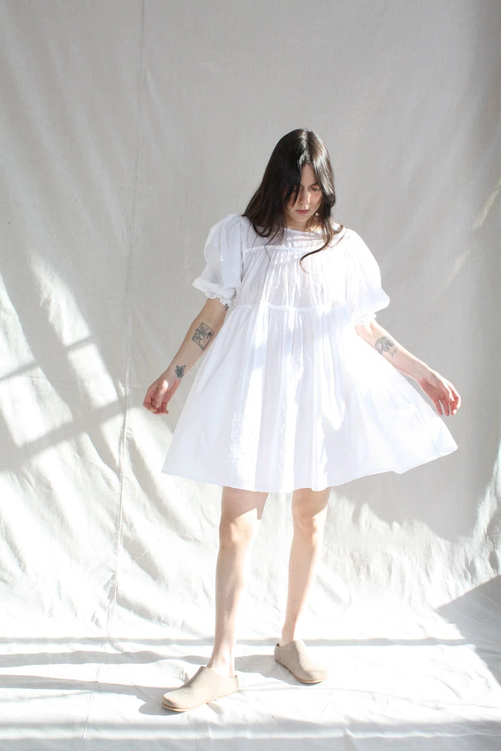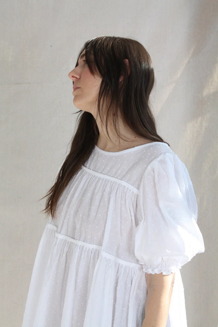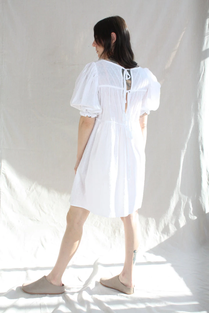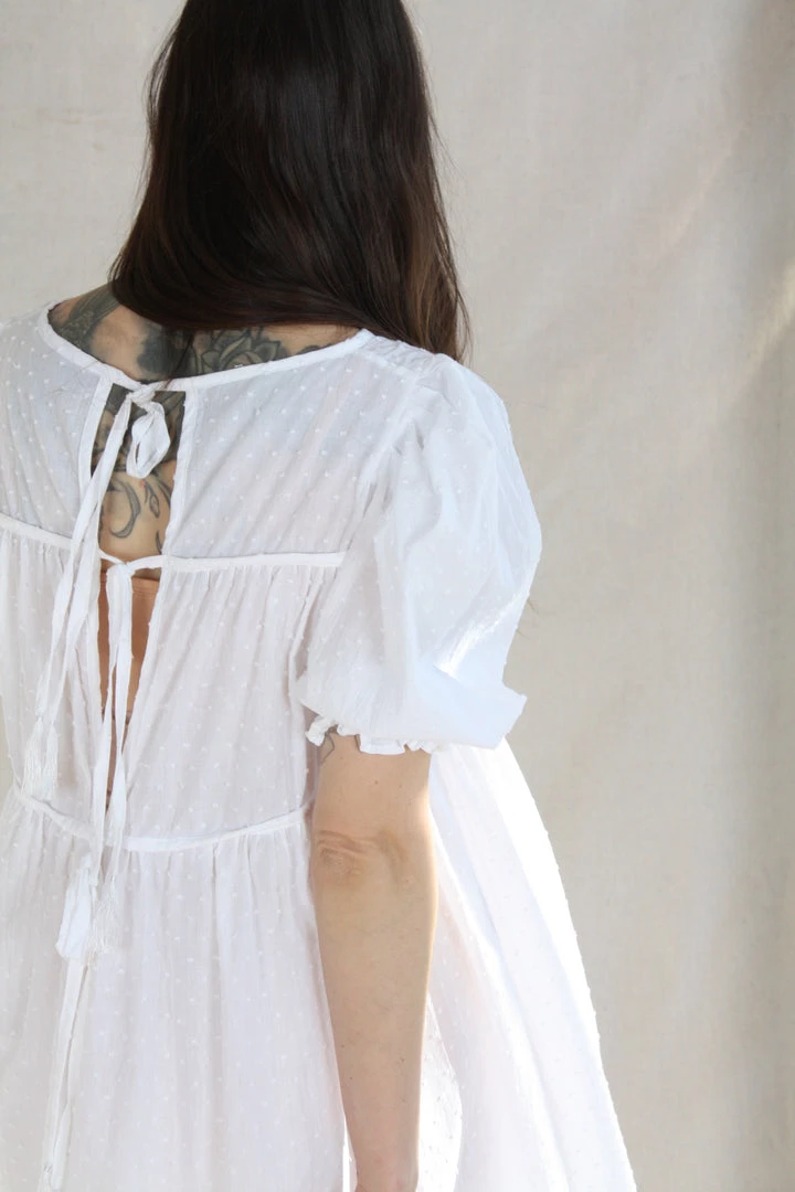 Dress with tiered bodice and puff sleeves with elastic cuffs. Dress can be worn with the ties in the front or back. Hits mid-thigh or just above the knee depending on your height. Slightly sheer.