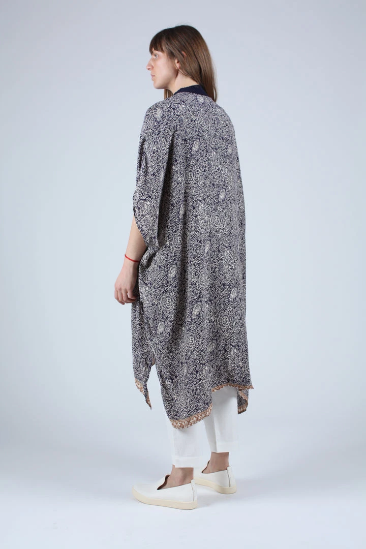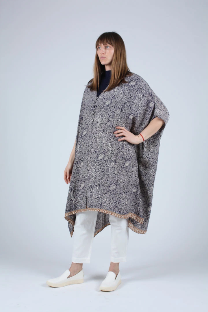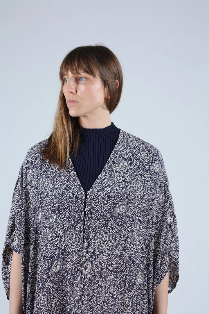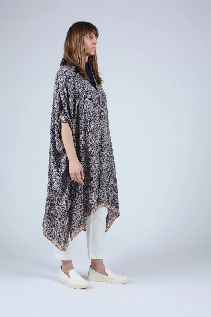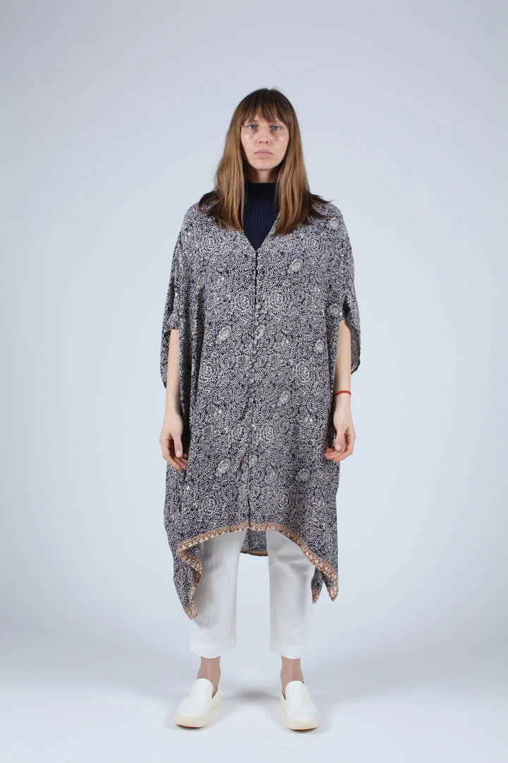 Silk kaftan with covered buttons going all down the front. Button closure down the sides.