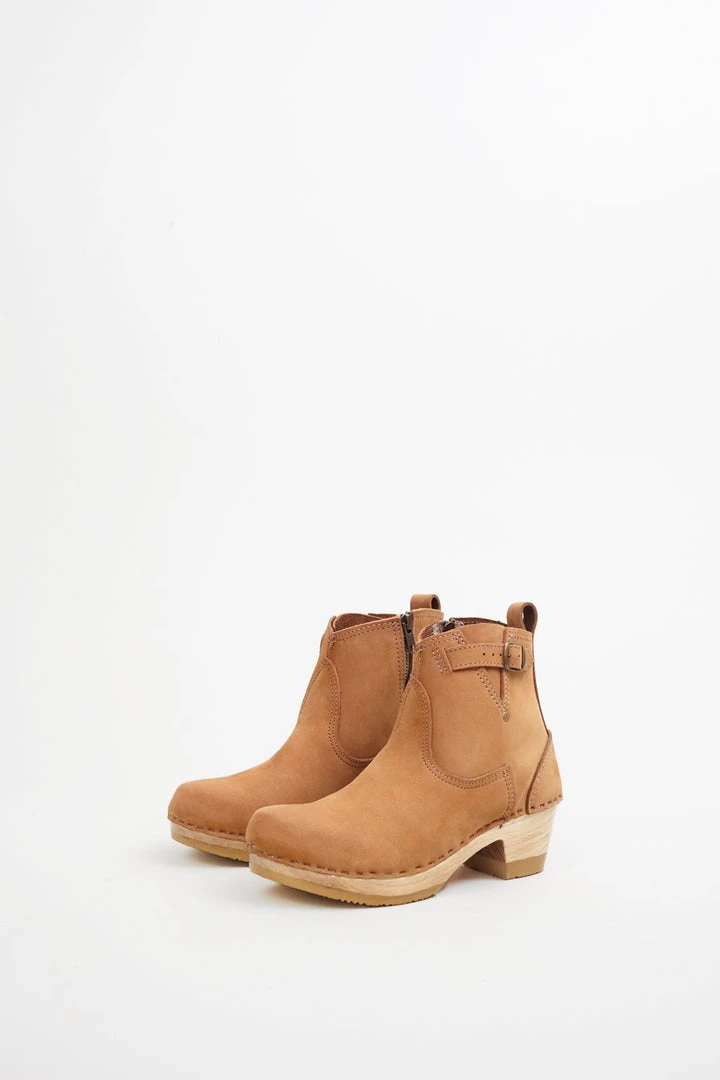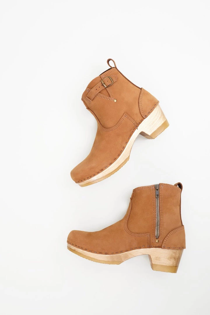 Motorcycle-inspired clog boot in classic black leather. Adjustable side buckle and metal zipper closure. 5” tall shaft. Black leather toe, heel cap, and pull tab. Mid heel base.