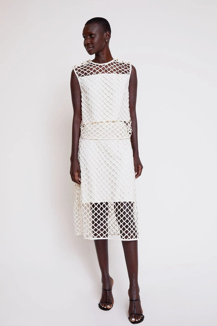 Mod meets modern in this sleeveless, off-white cotton top. Macrame netting overlay with 3-button closure at each shoulder. Wear with the Carla Macrame Skirt for a complete look.