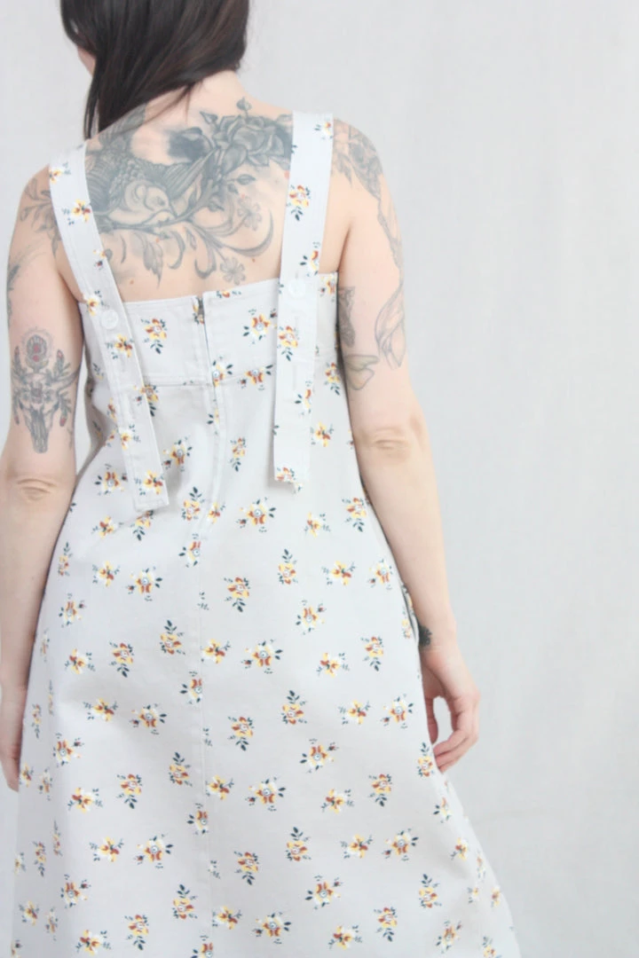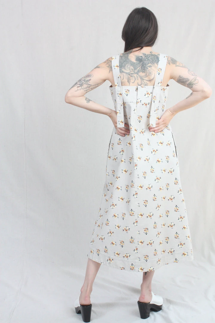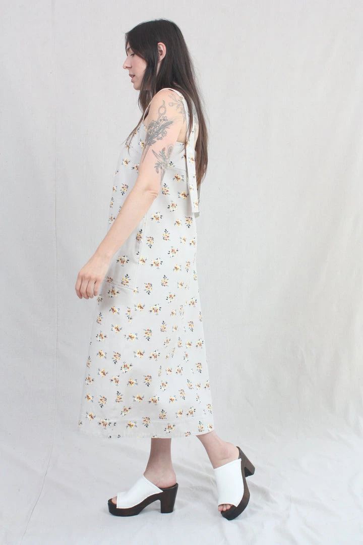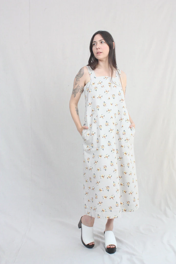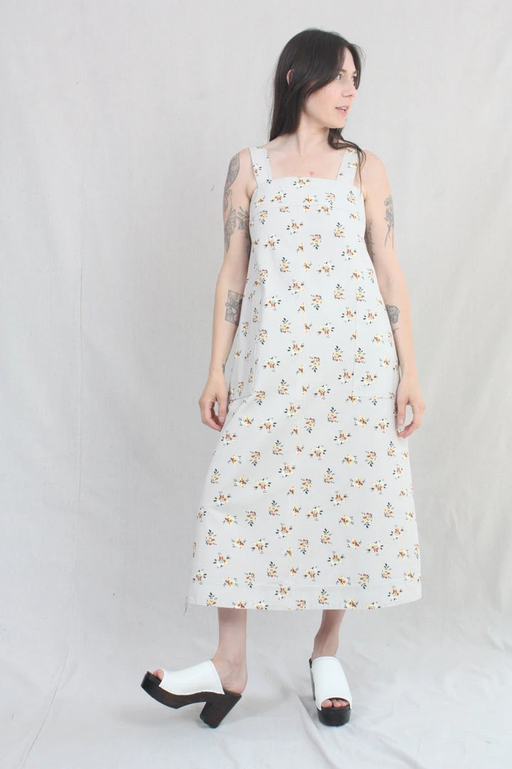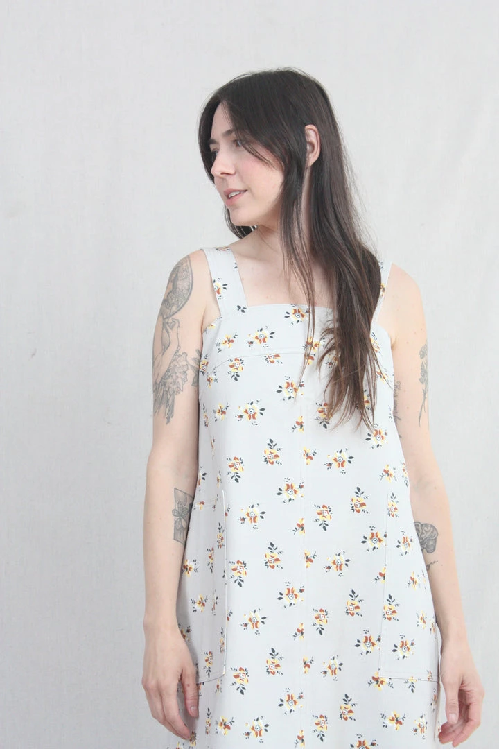 Throw on and go apron style dress in a midweight printed cotton twill. Square neckline. Side pockets. Mid length. Wear alone or layer over a t-shirt or long sleeve.