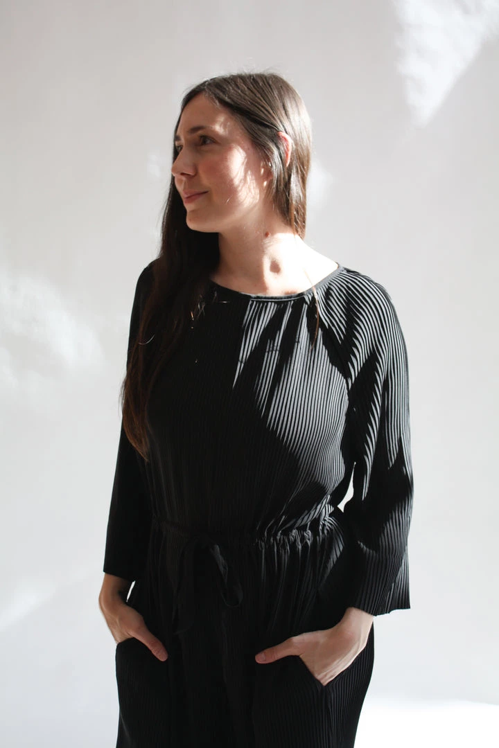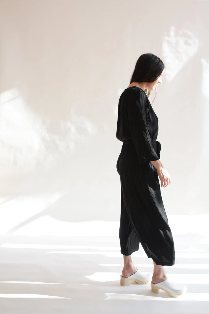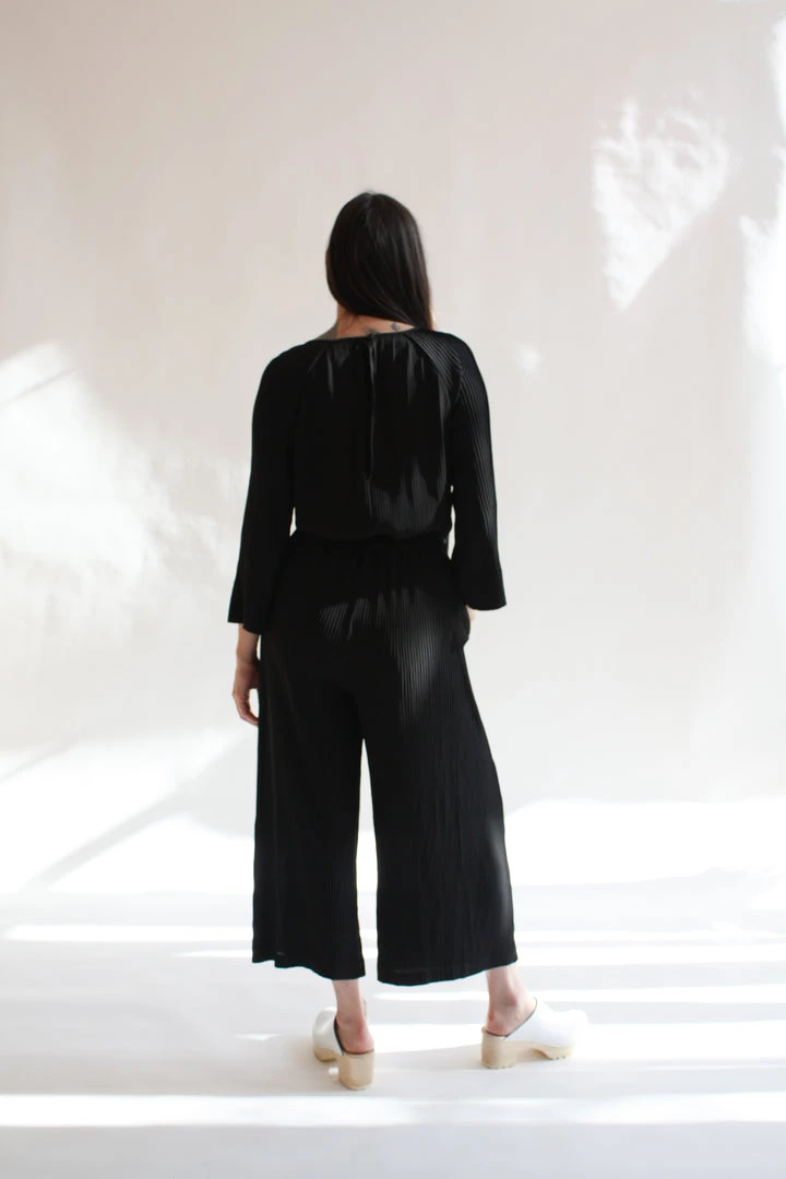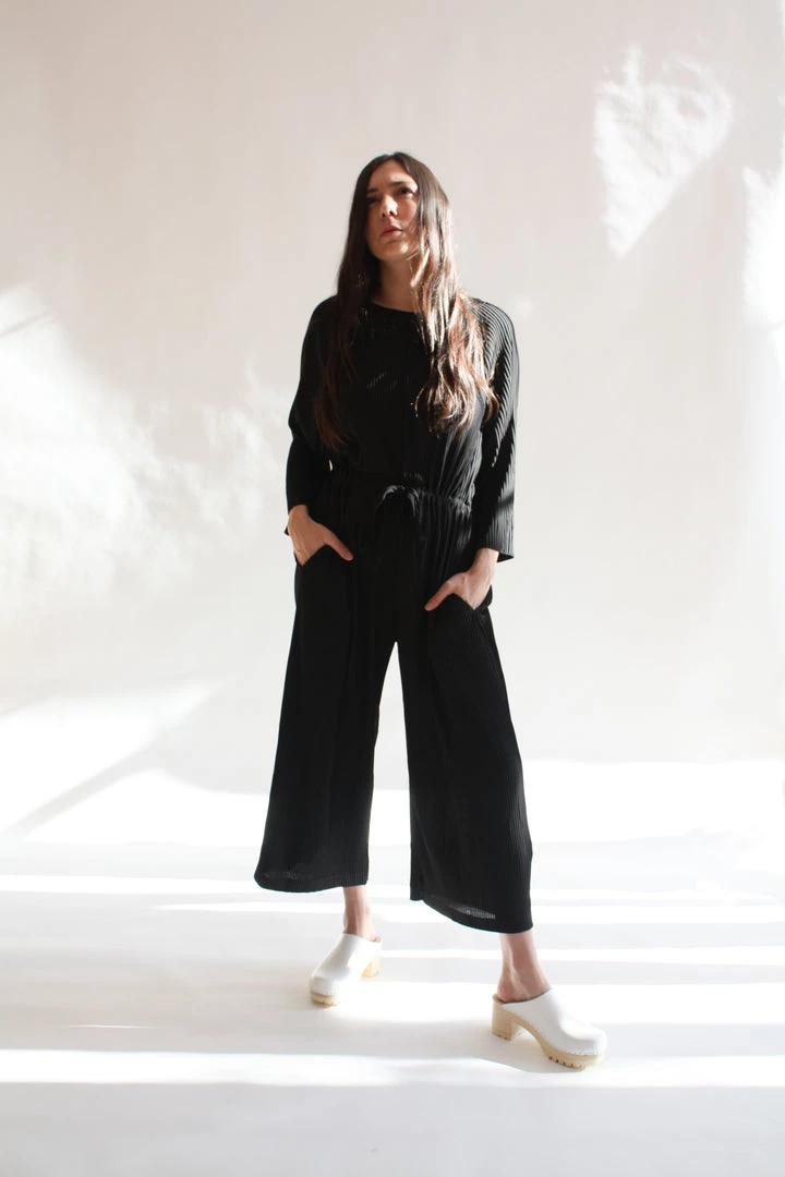 Wide-legged pleated jumpsuit. Full drawstring waist. Single button closure at back of neckline. Two patch pockets. Wide 3/4 length sleeve.