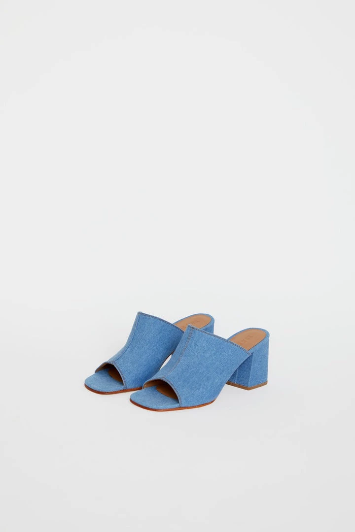 Open toe slide on chunky heel. Blue denim fabric upper with ochre stitching. Center seam detail. Square footbed. Fully lined.
