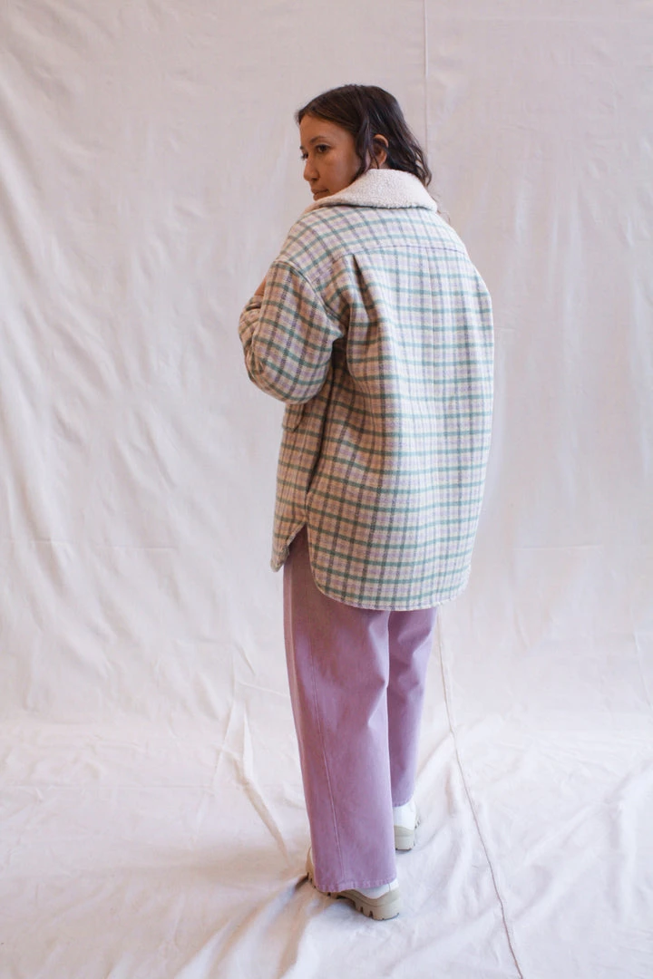 Workwear-inspired plaid jacket with contrasting collar. Oversized, boxy fit. Button down front and curved bottom hem. Lined. Front patch pockets and side pockets.
