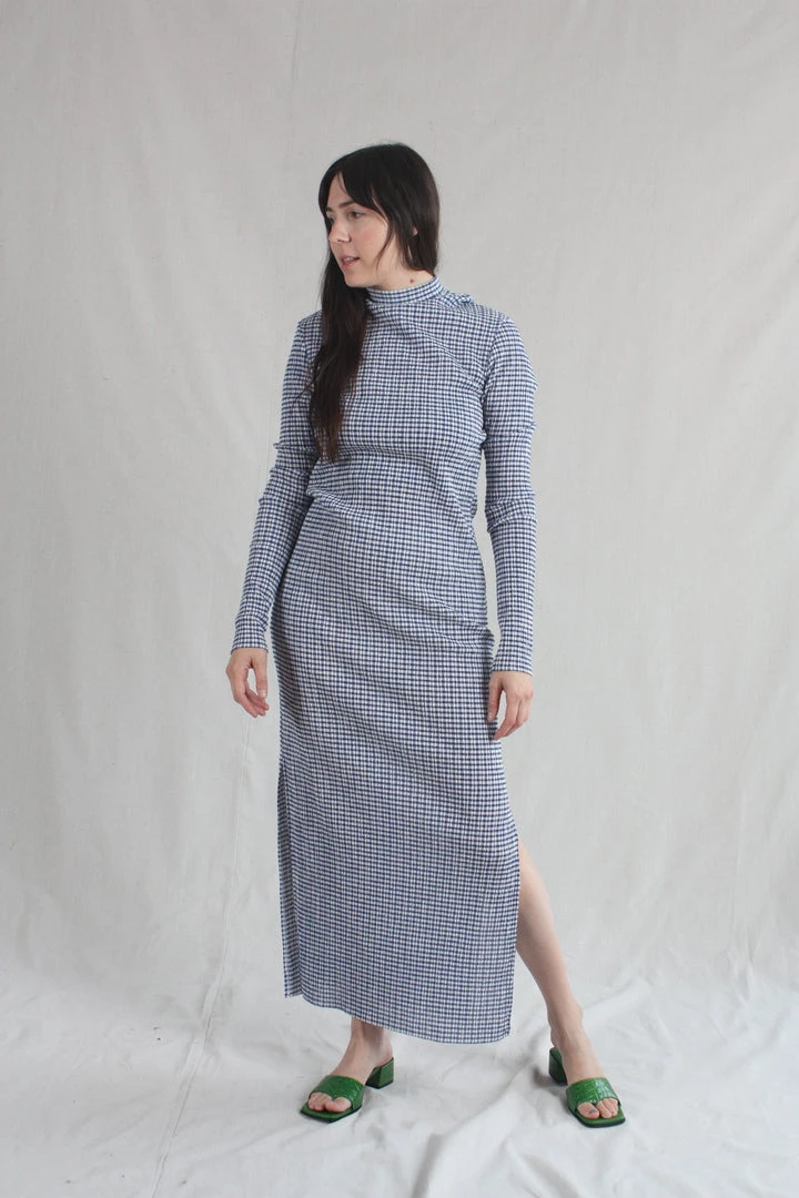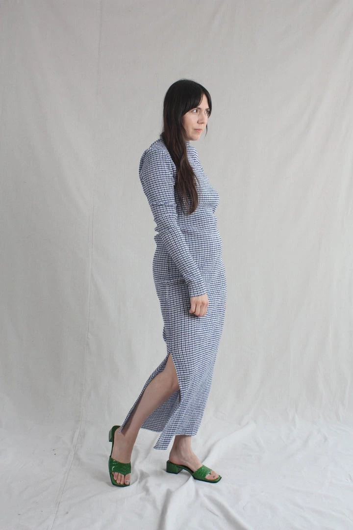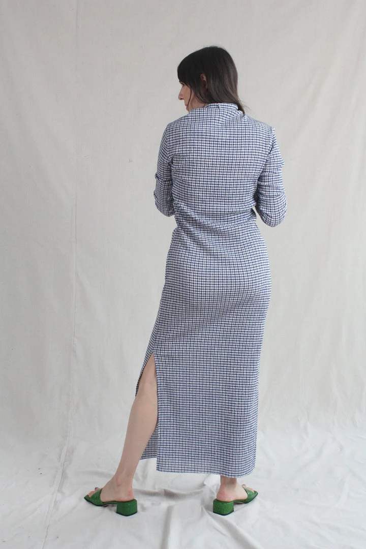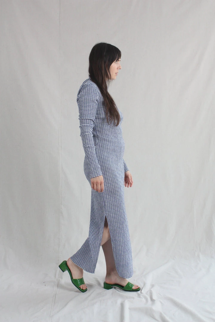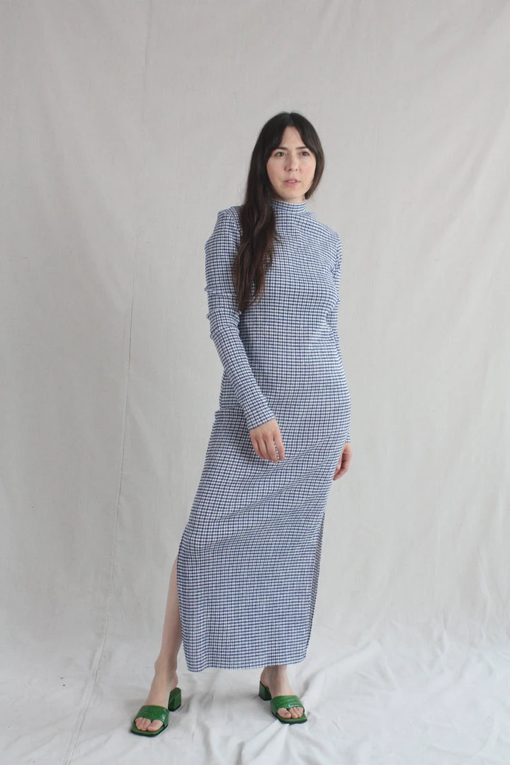 Longsleeve stretchy, textured knit gingham dress with a mock neck. Perfect for layering over knit pants or wearing it’s own.