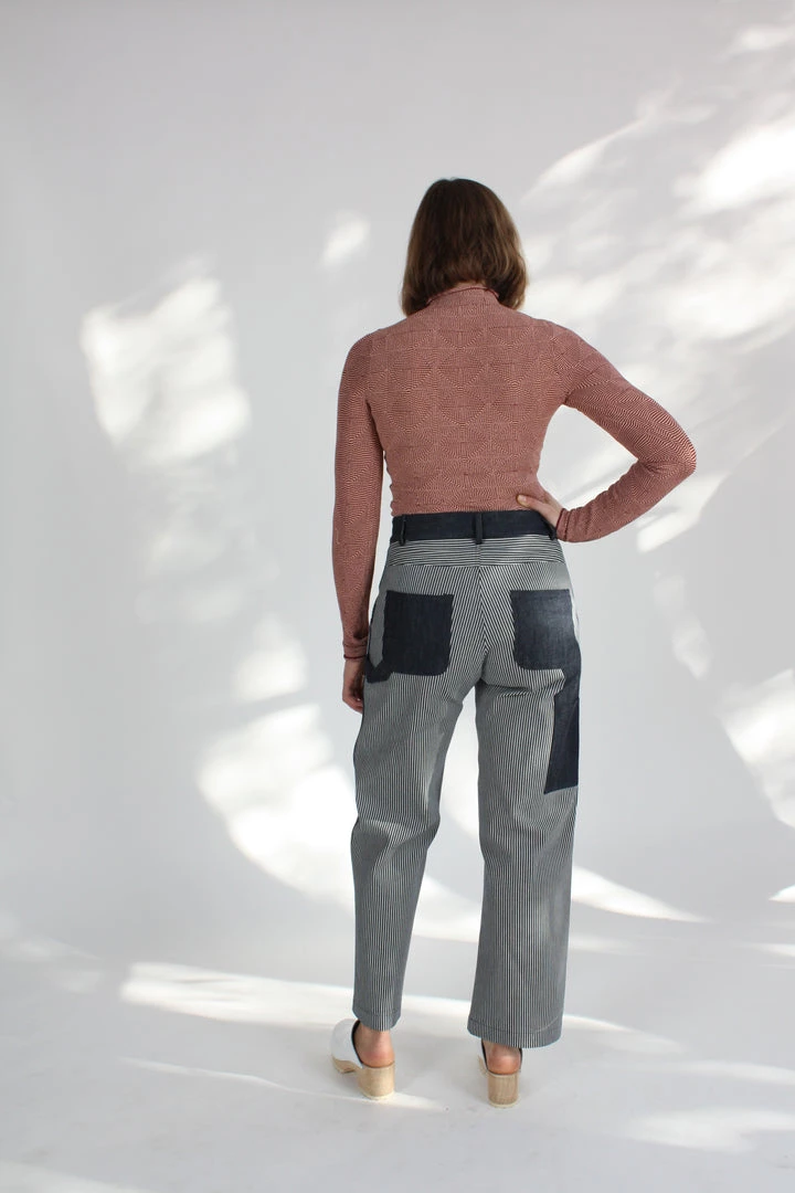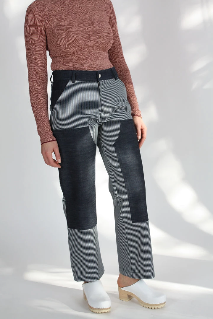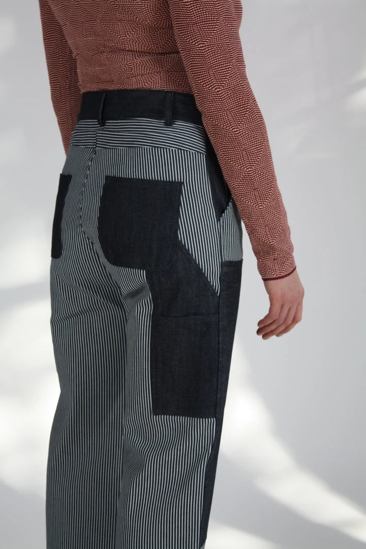 Nomia signature painter pants in hickory stripe with indigo contrast. Made from headstock heavyweight denim,