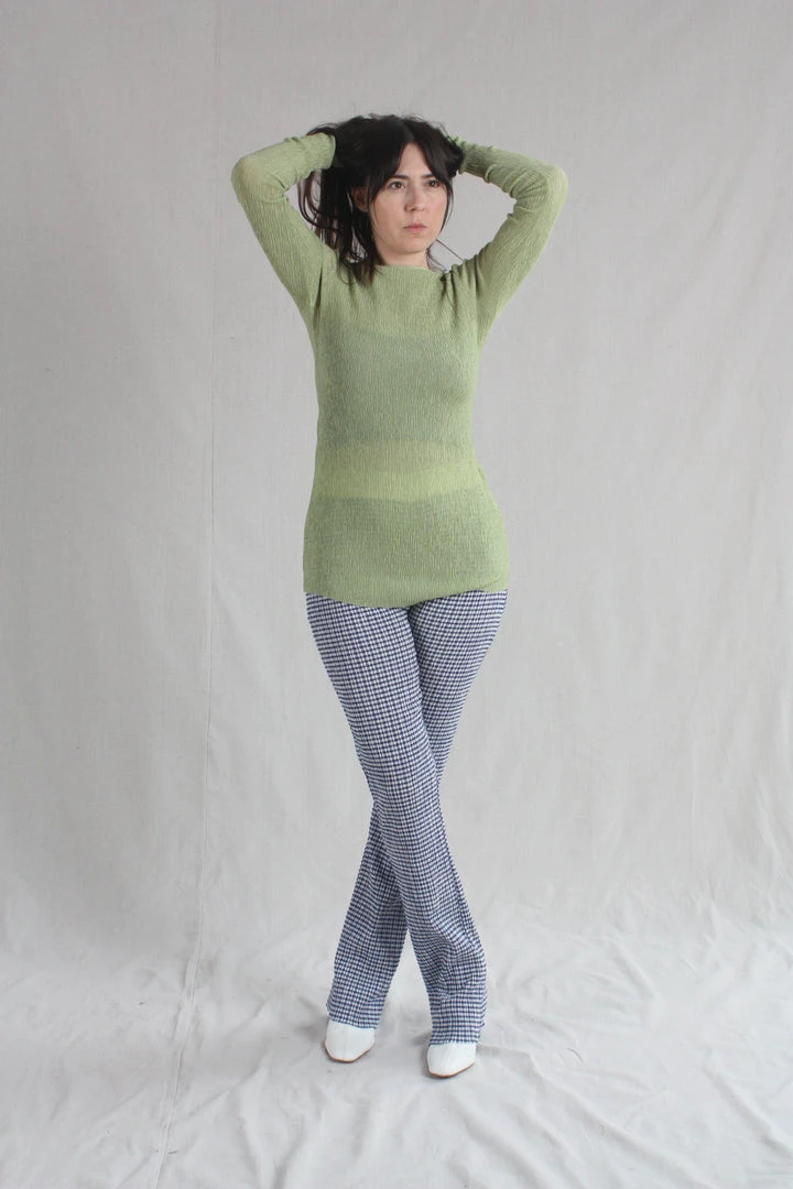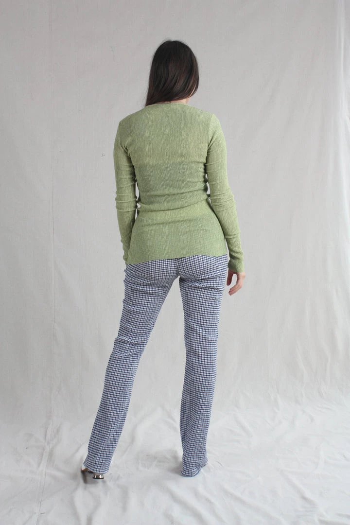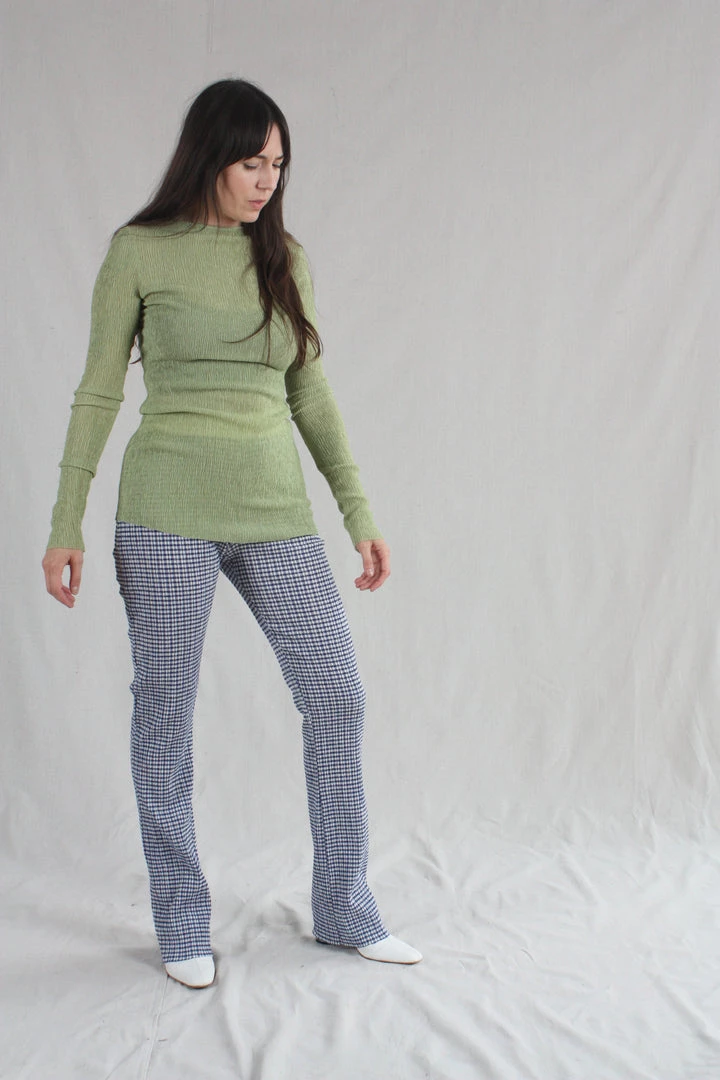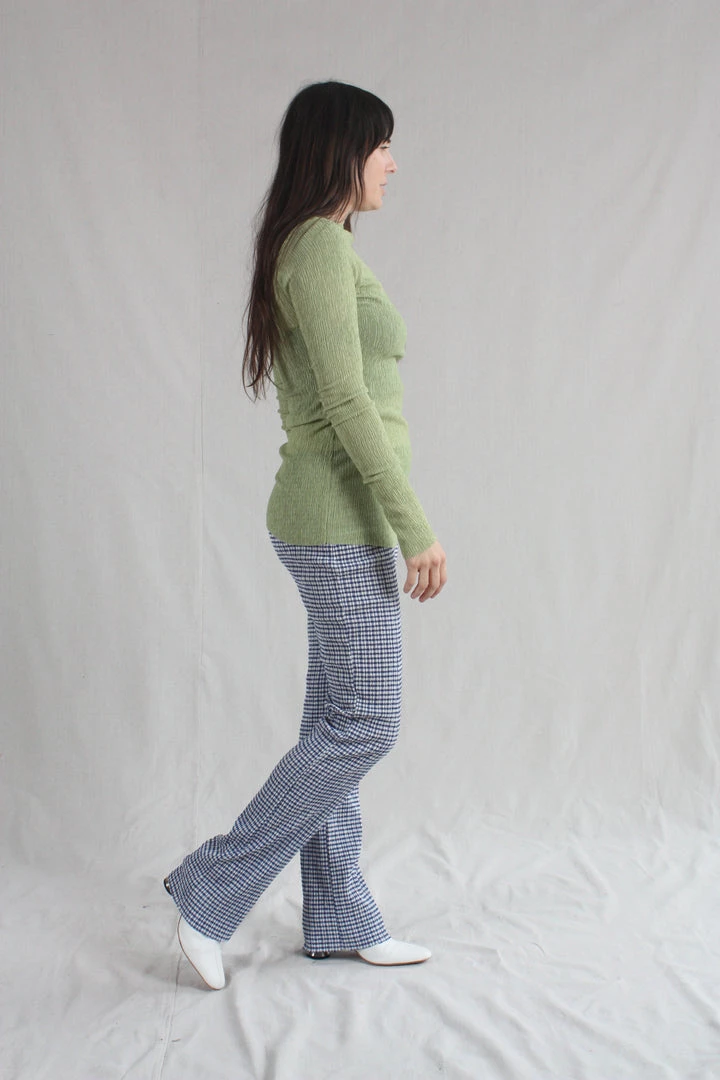 Stretchy knit pants with contrast elastic waistband, raw hem with slight flare at ankle