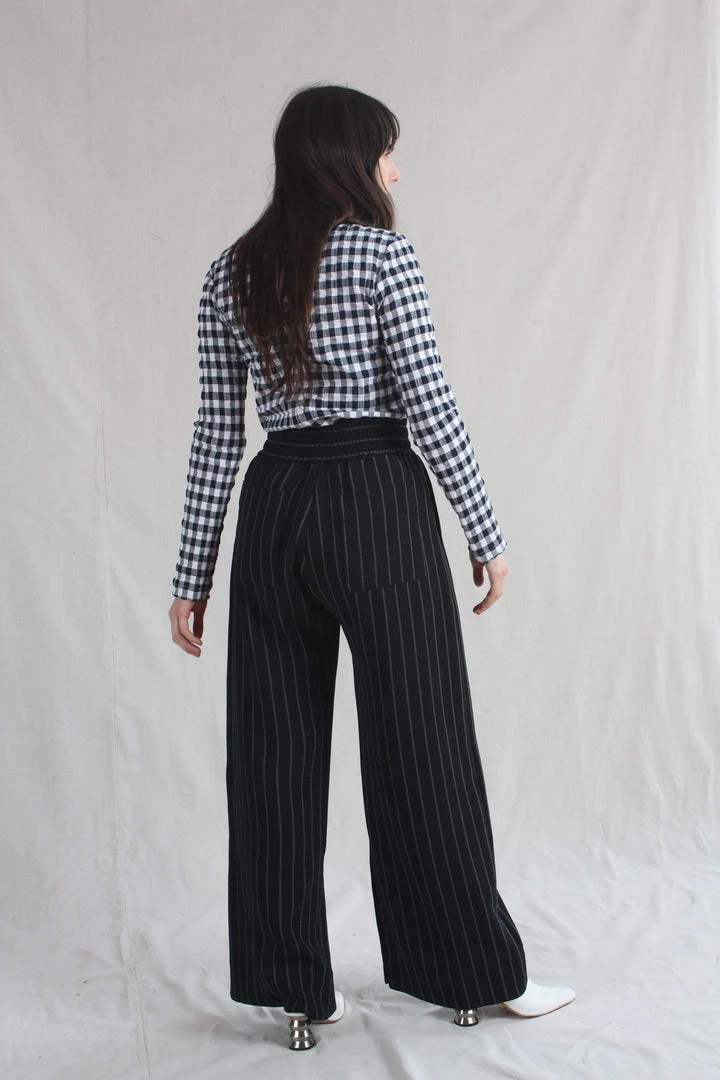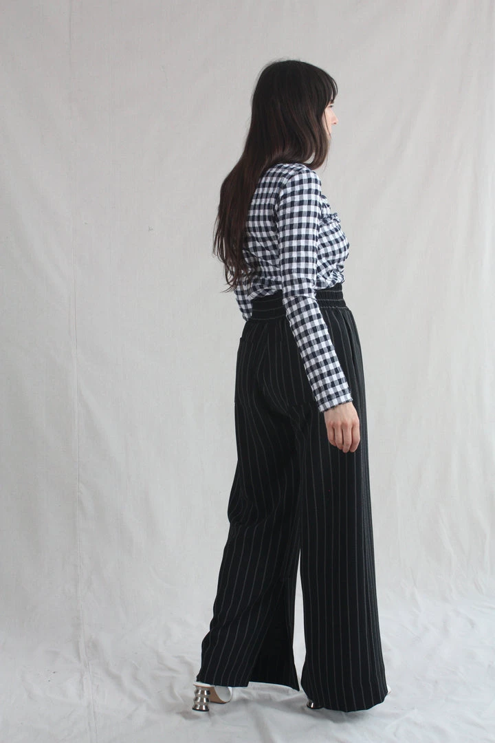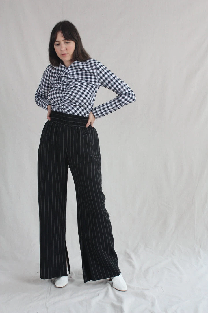 Wide elastic waistband with side seam pockets and inner seam slits at the hem of the pants. Back Pocket. Pinstripe crepe.